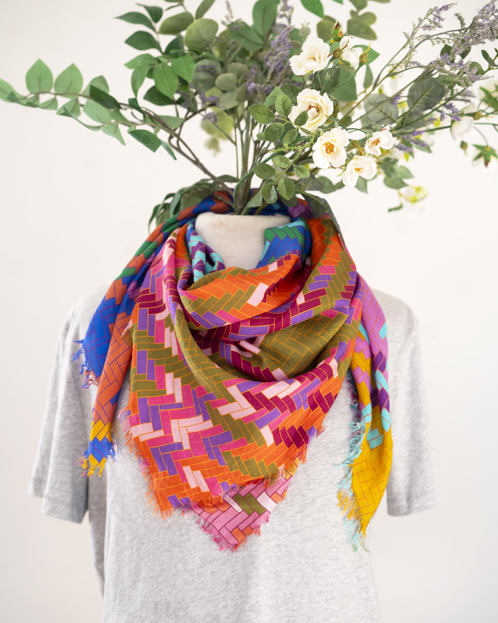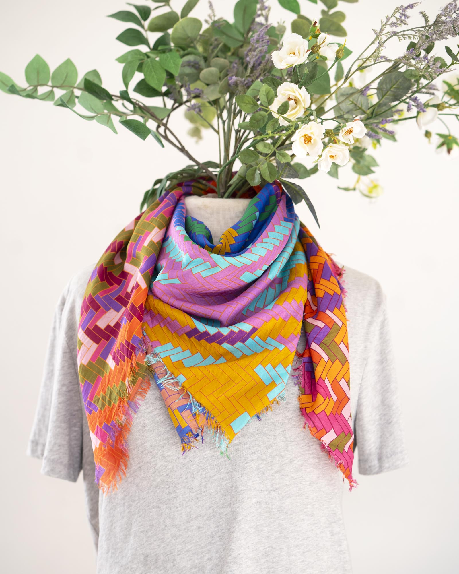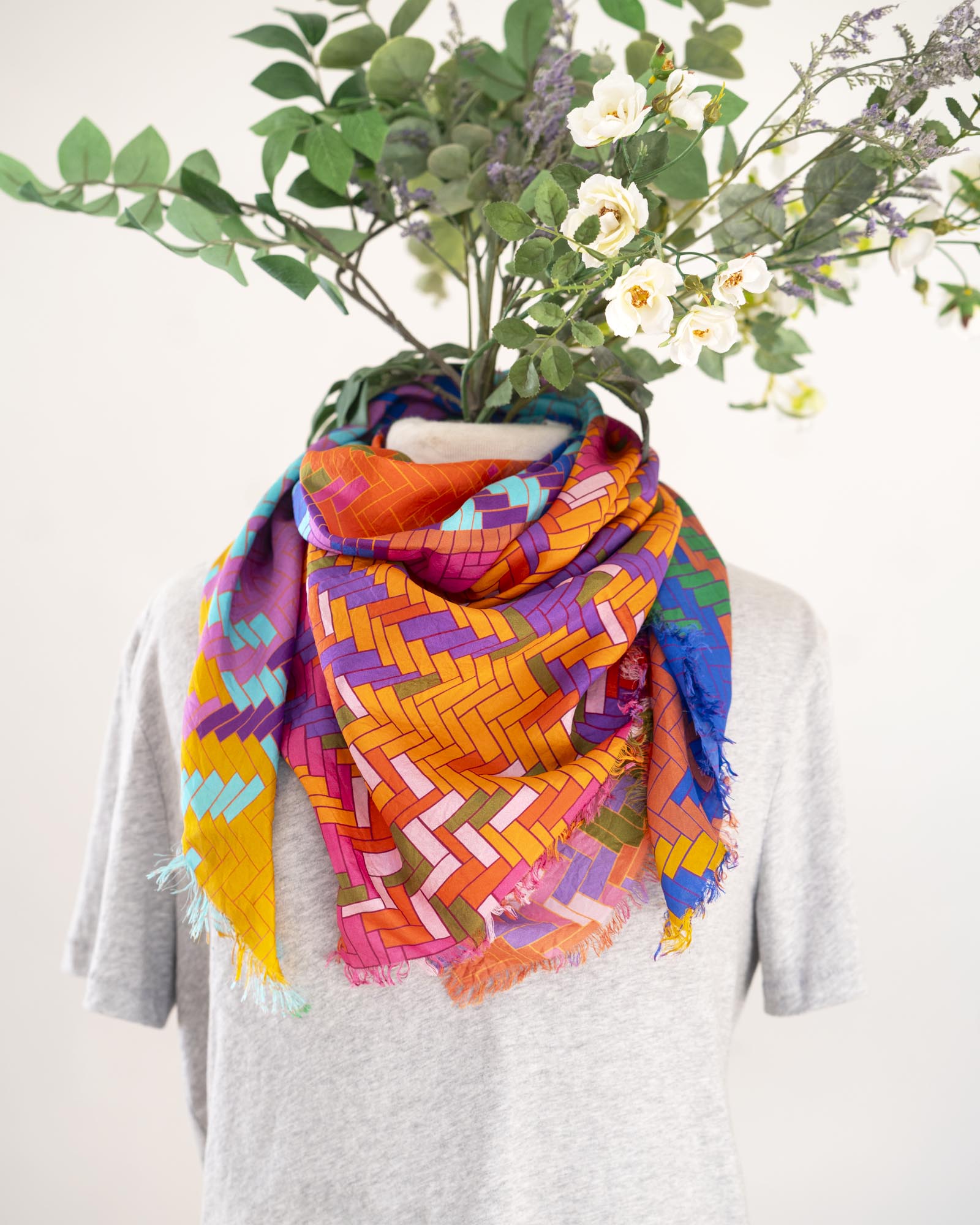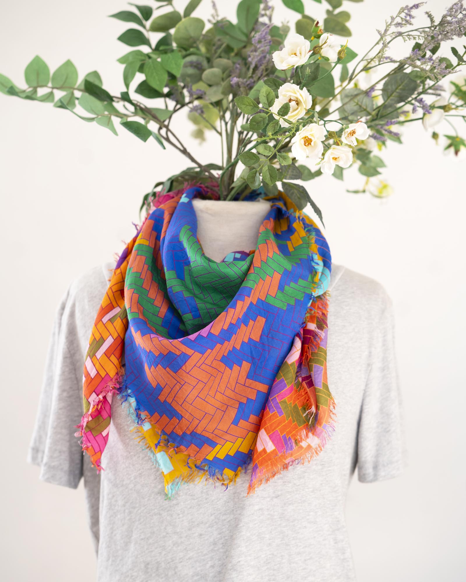 The geometric patterns were drawn by Jess, cut and fringed in Truckee, California, the fabric was printed in the UK using GOTS Ecocare certified inks.