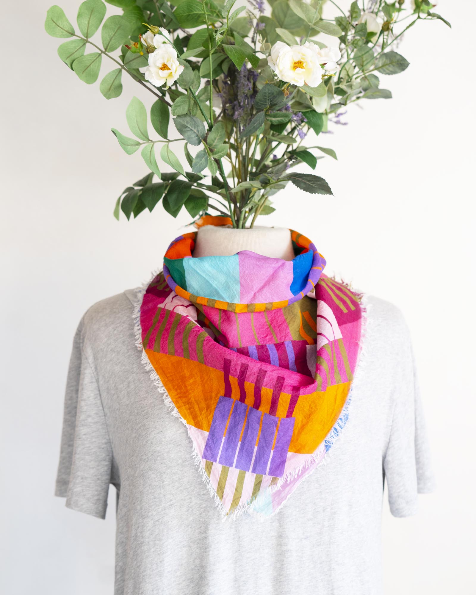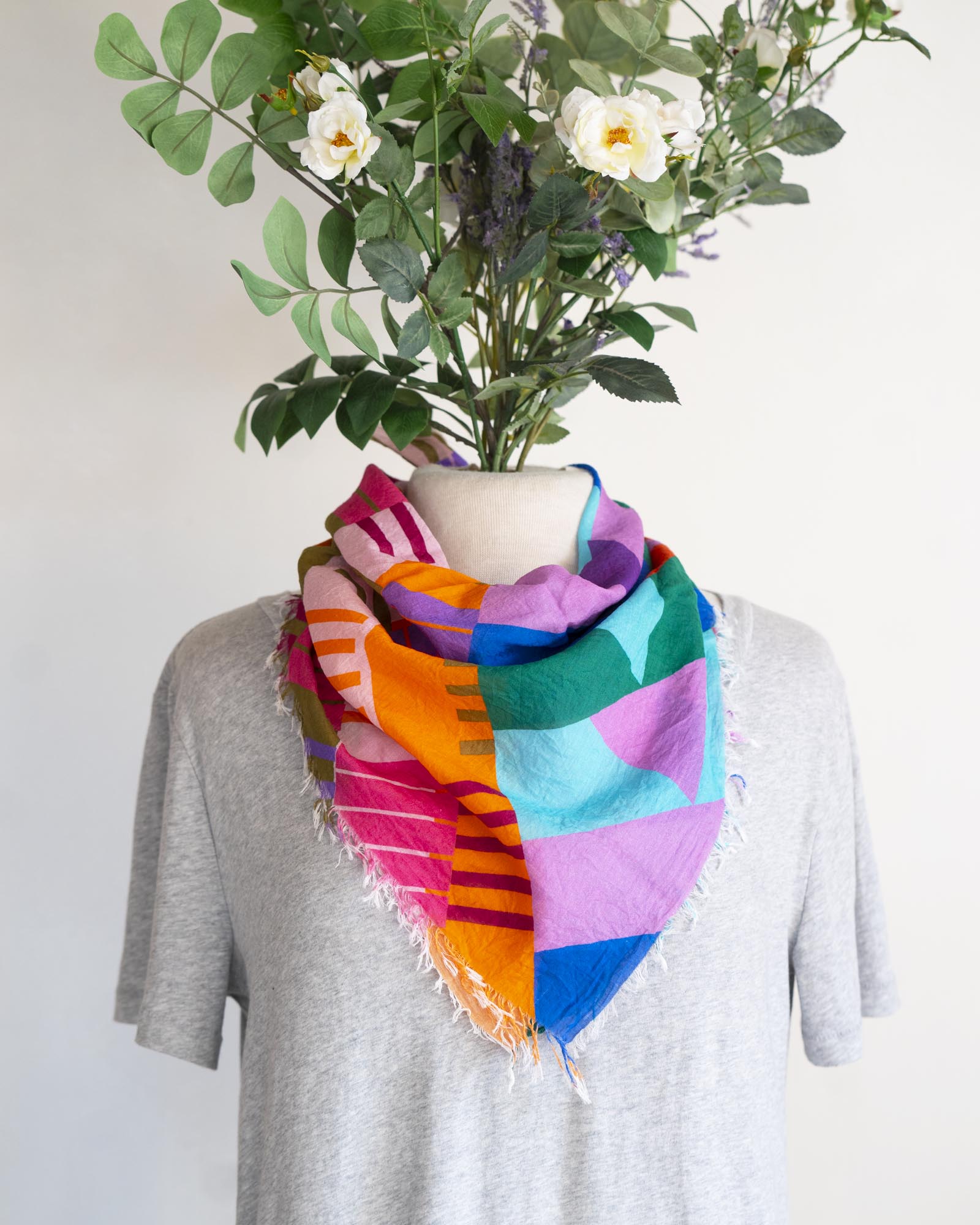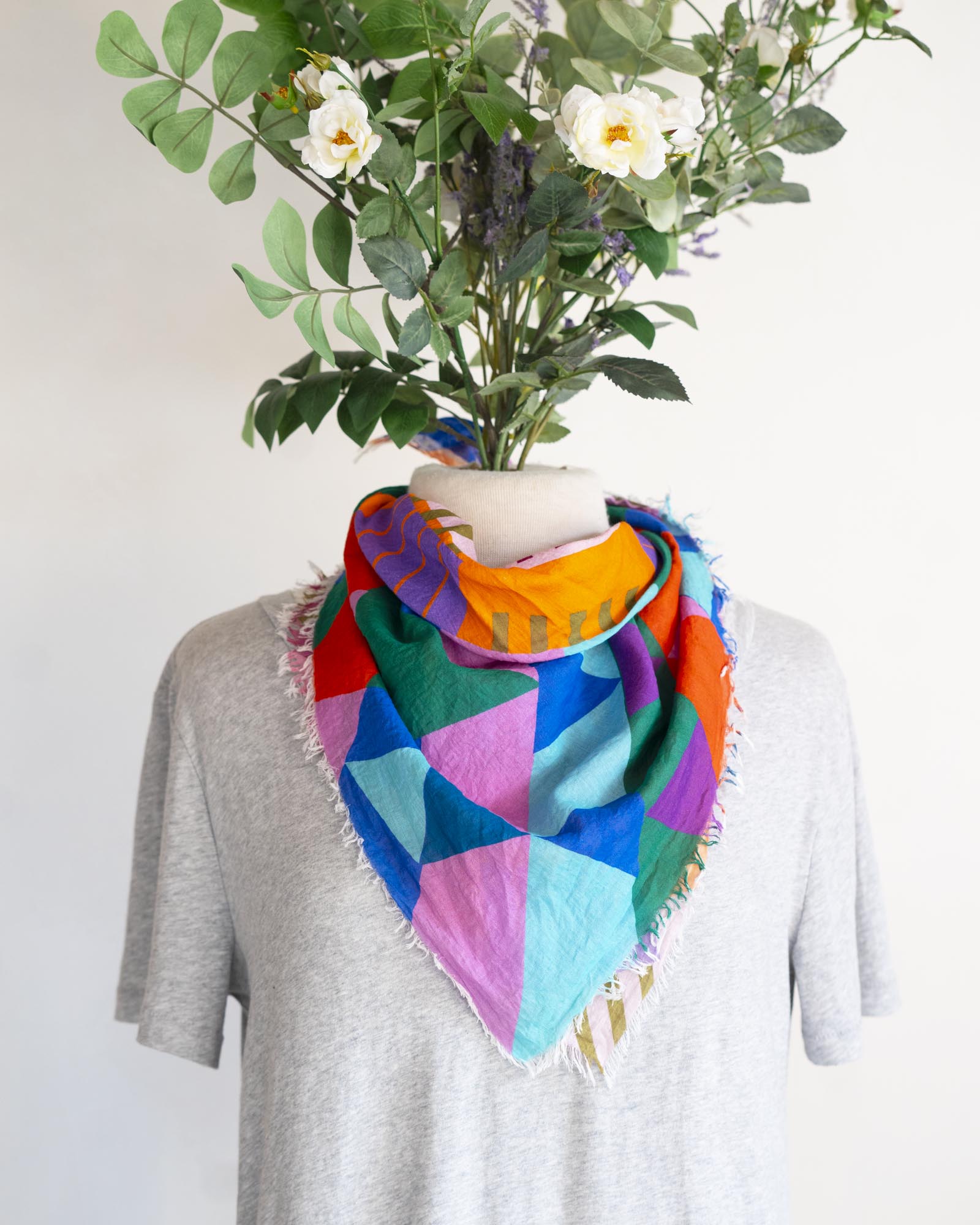 Colourful and lightweight, there are so many ways to wear this scarf. Embrace the unique interplay of two totally different colour palettes and geometric designs.