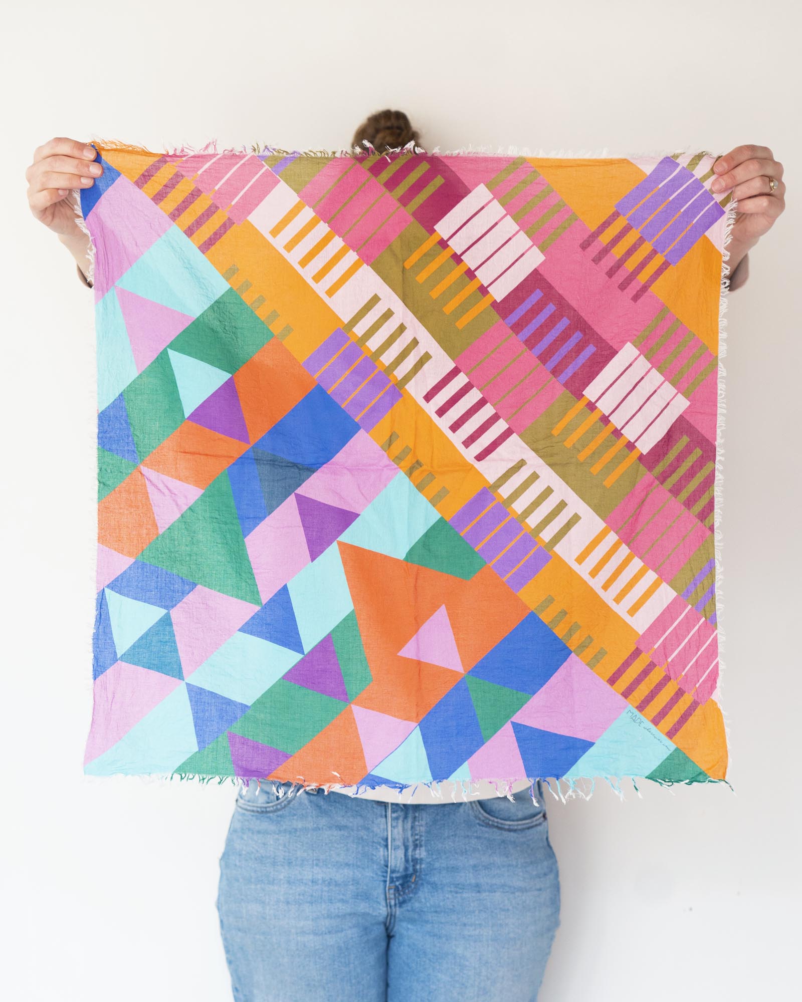 The geometric patterns were drawn by Jess, cut and fringed in Truckee, California, the fabric was printed in the UK using GOTS Ecocare certified inks.