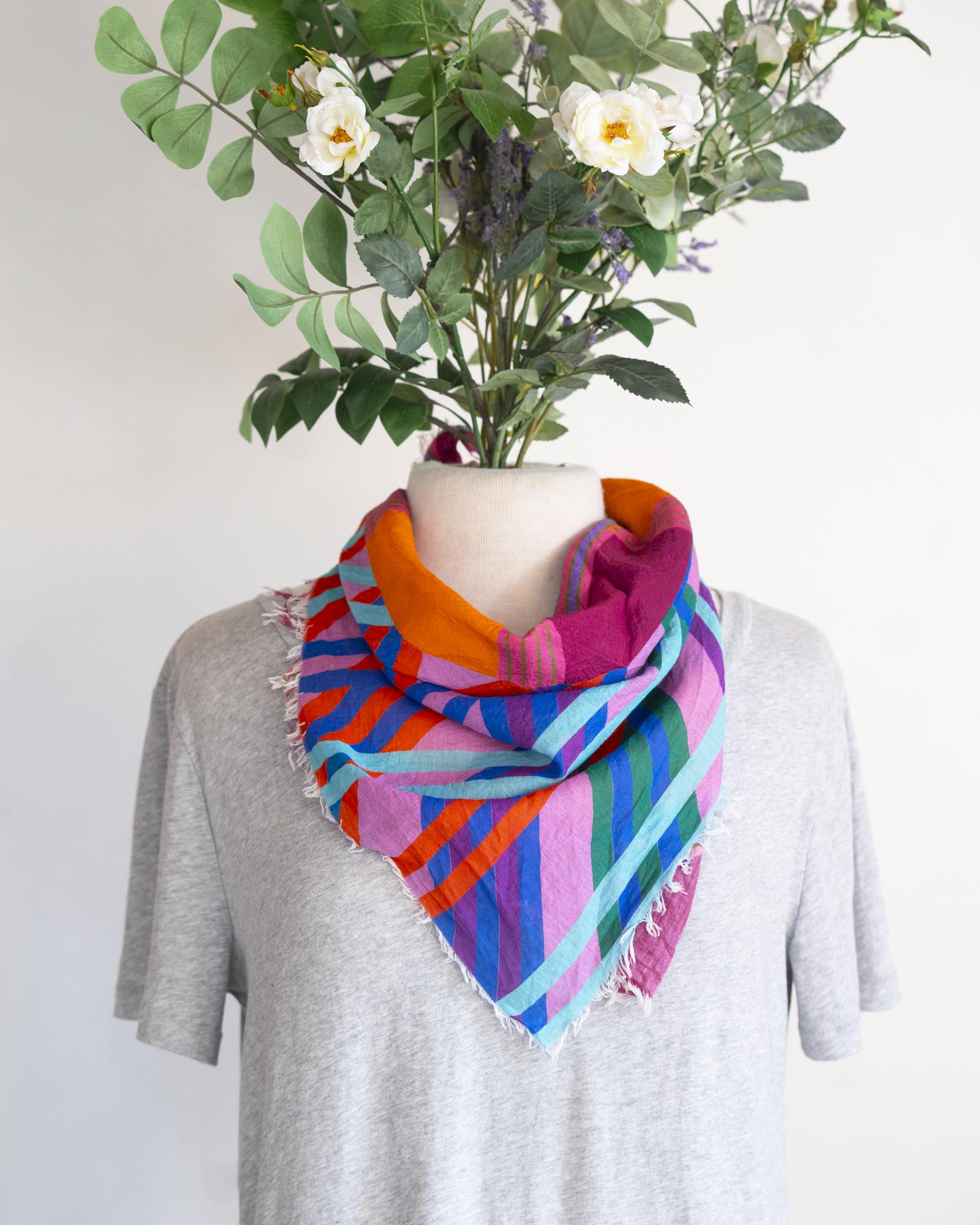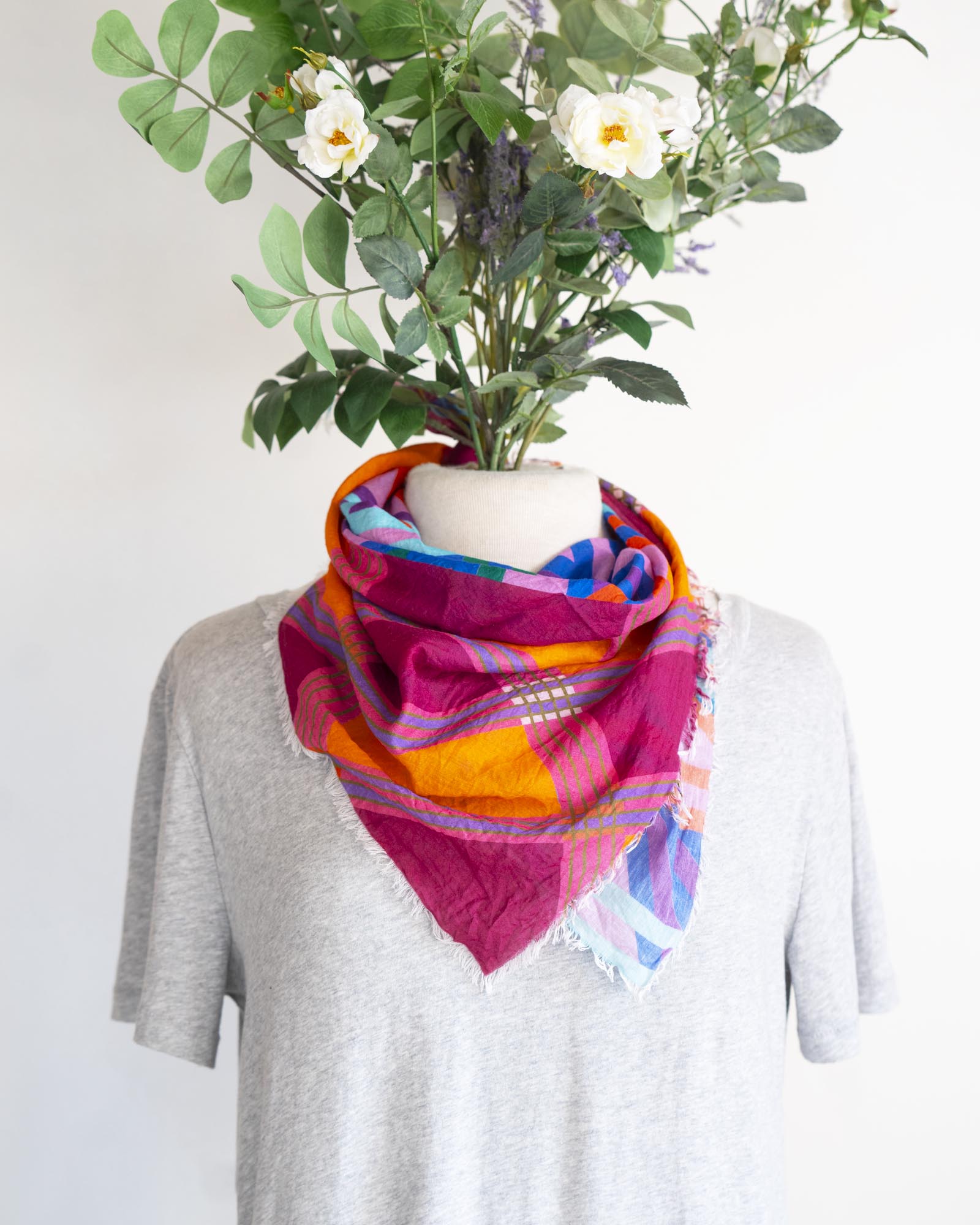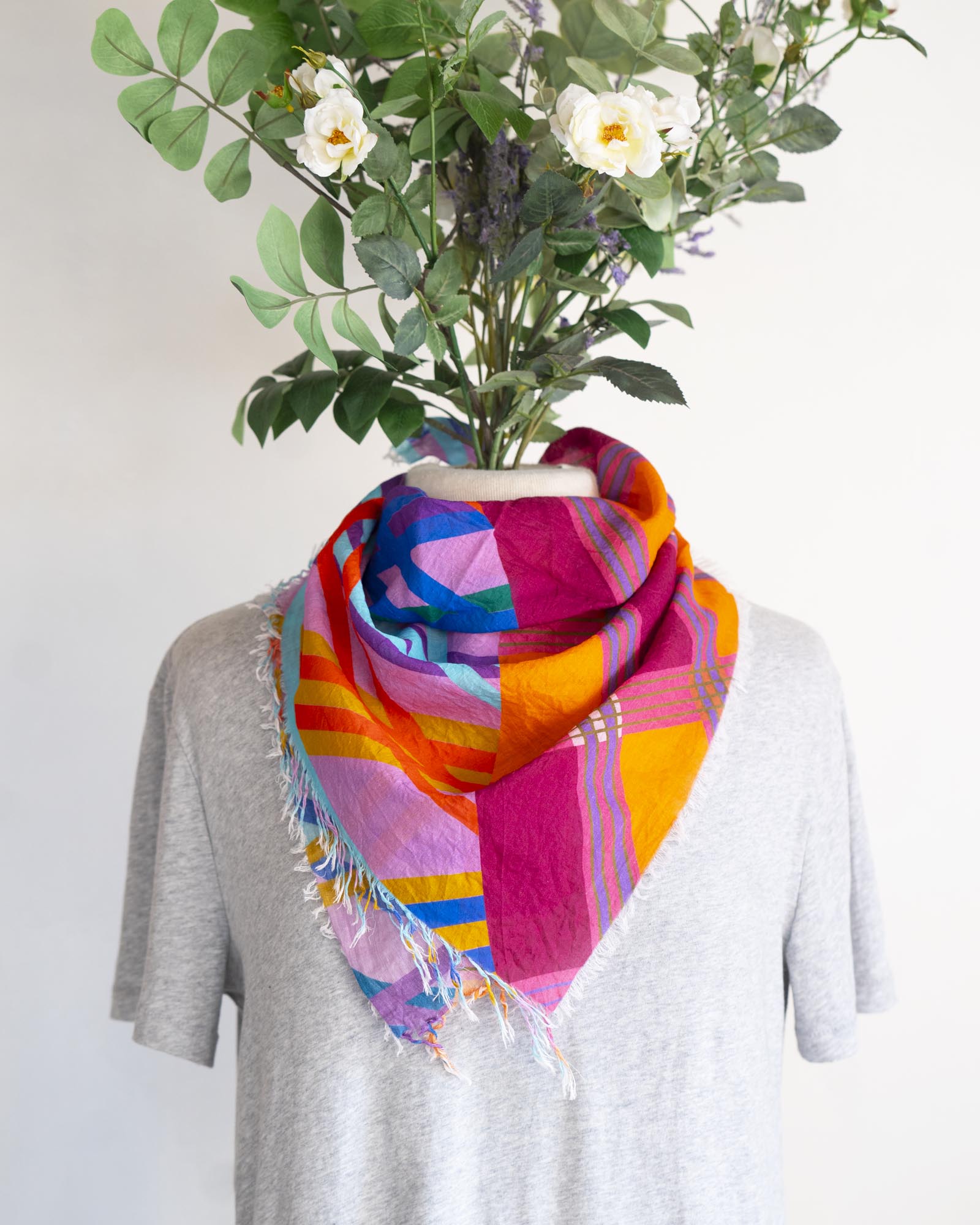 Colourful and lightweight, there are so many ways to wear this scarf. Embrace the unique interplay of two totally different colour palettes and geometric designs.