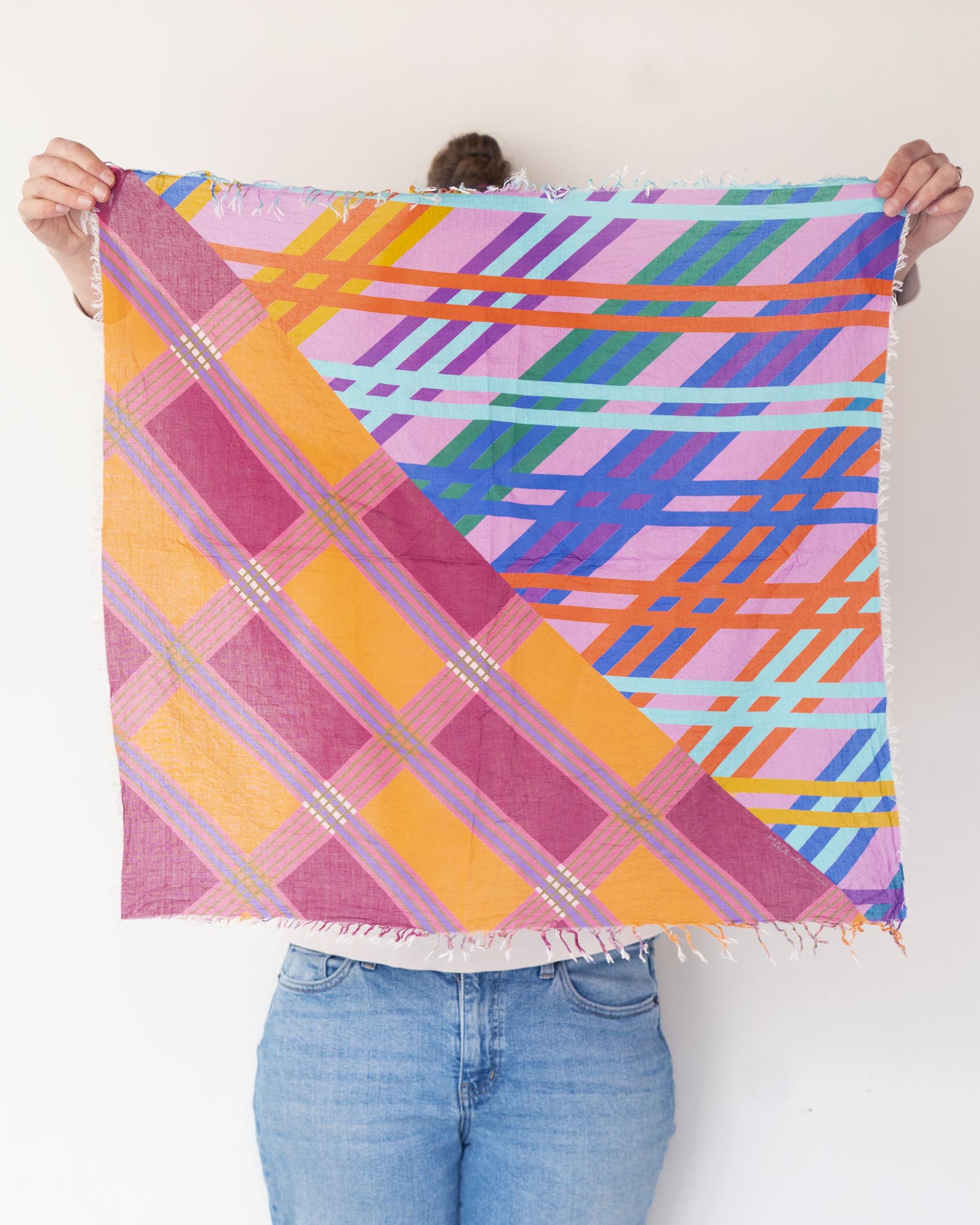 The geometric patterns were drawn by Jess, cut and fringed in Truckee, California, the fabric was printed in the UK using GOTS Ecocare certified inks.