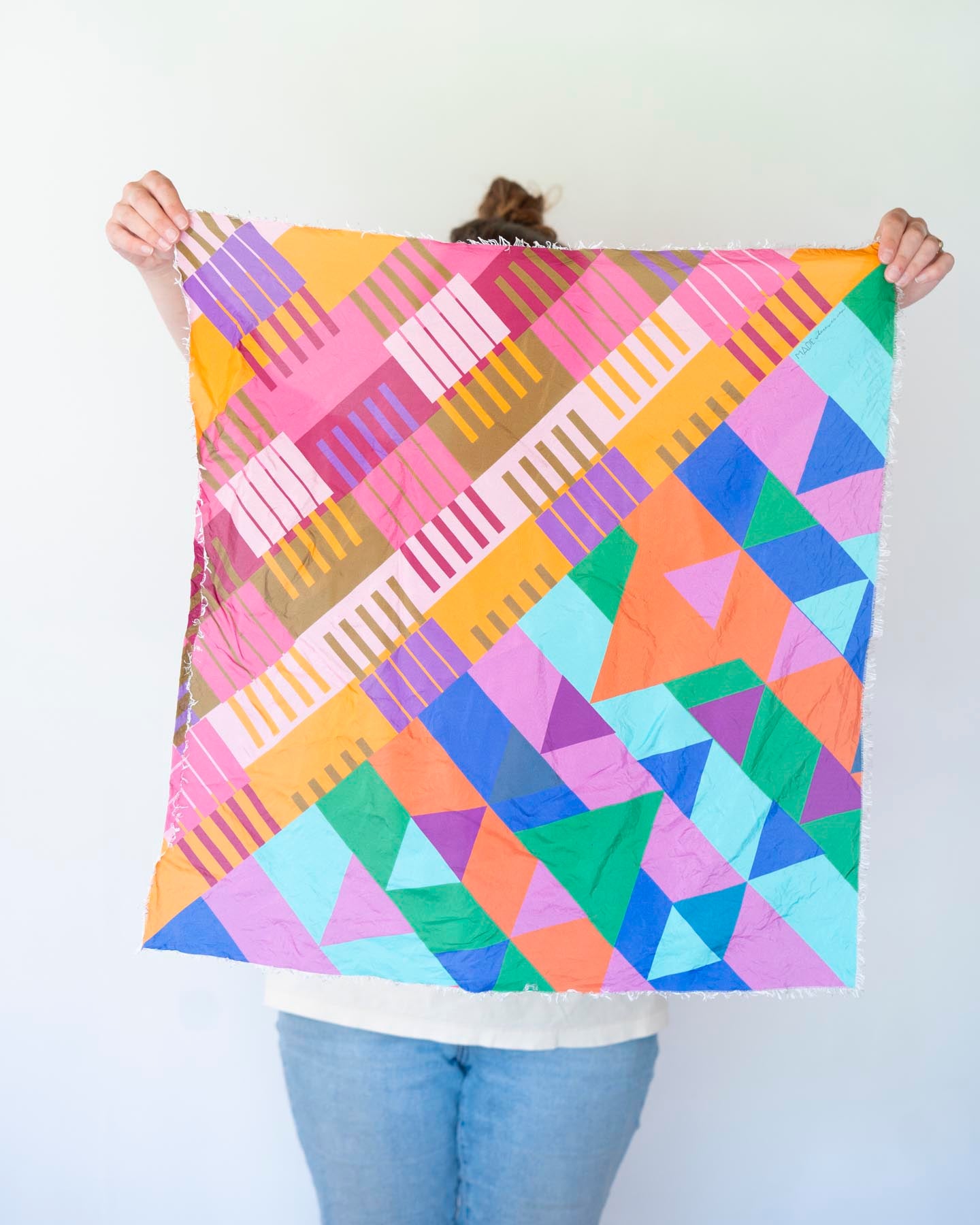 The geometric patterns were designed by Jess, cut and fringed in Truckee, California, the fabric was printed in the UK using GOTS Ecocare certified inks.