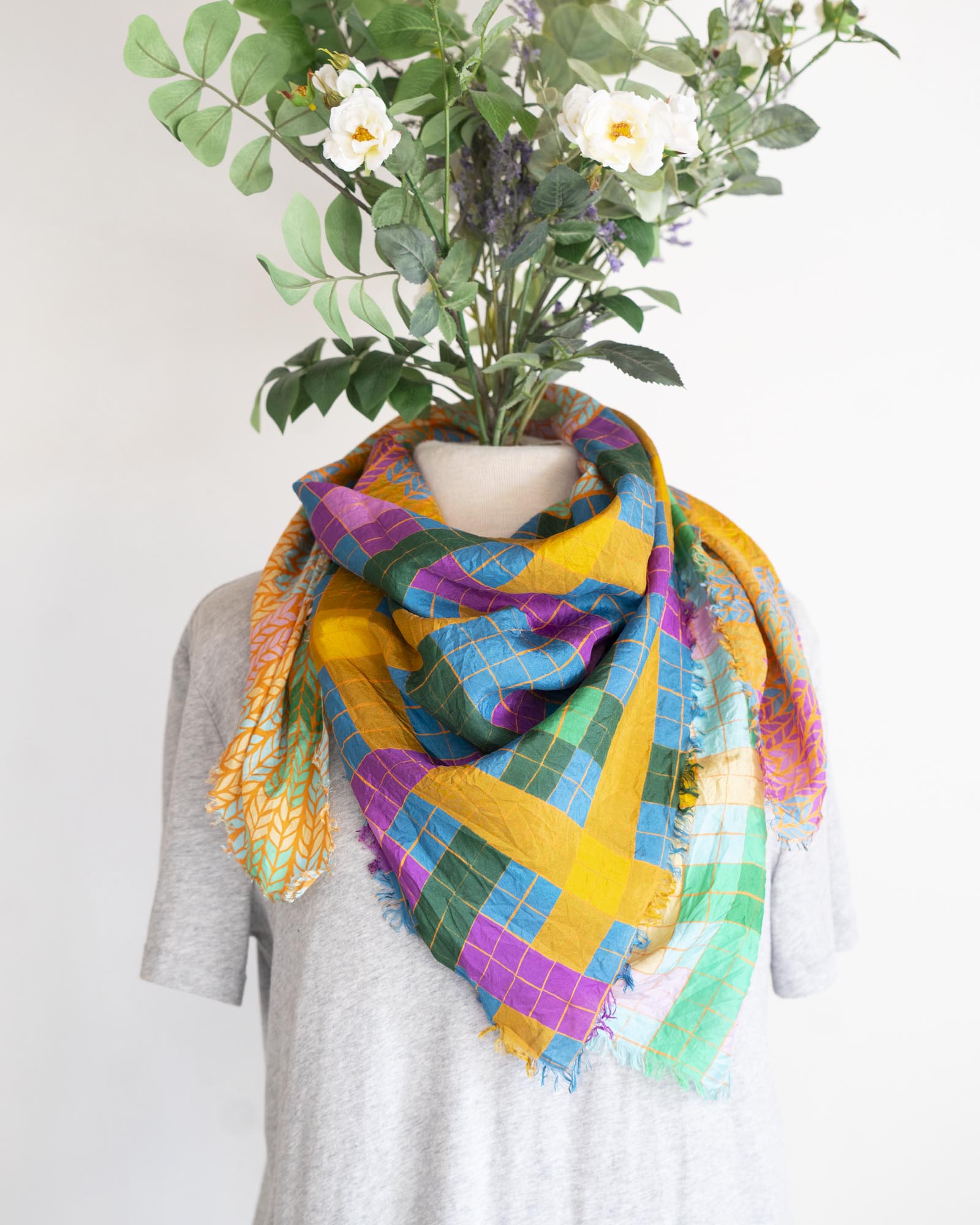 Inspired by the shapes found in fabric when knit or woven, there are multiple ways to wear this colourful and lightweight scarf. With four tonal variations of the same colour, you can change with way you wear the scarf depending on your mood.