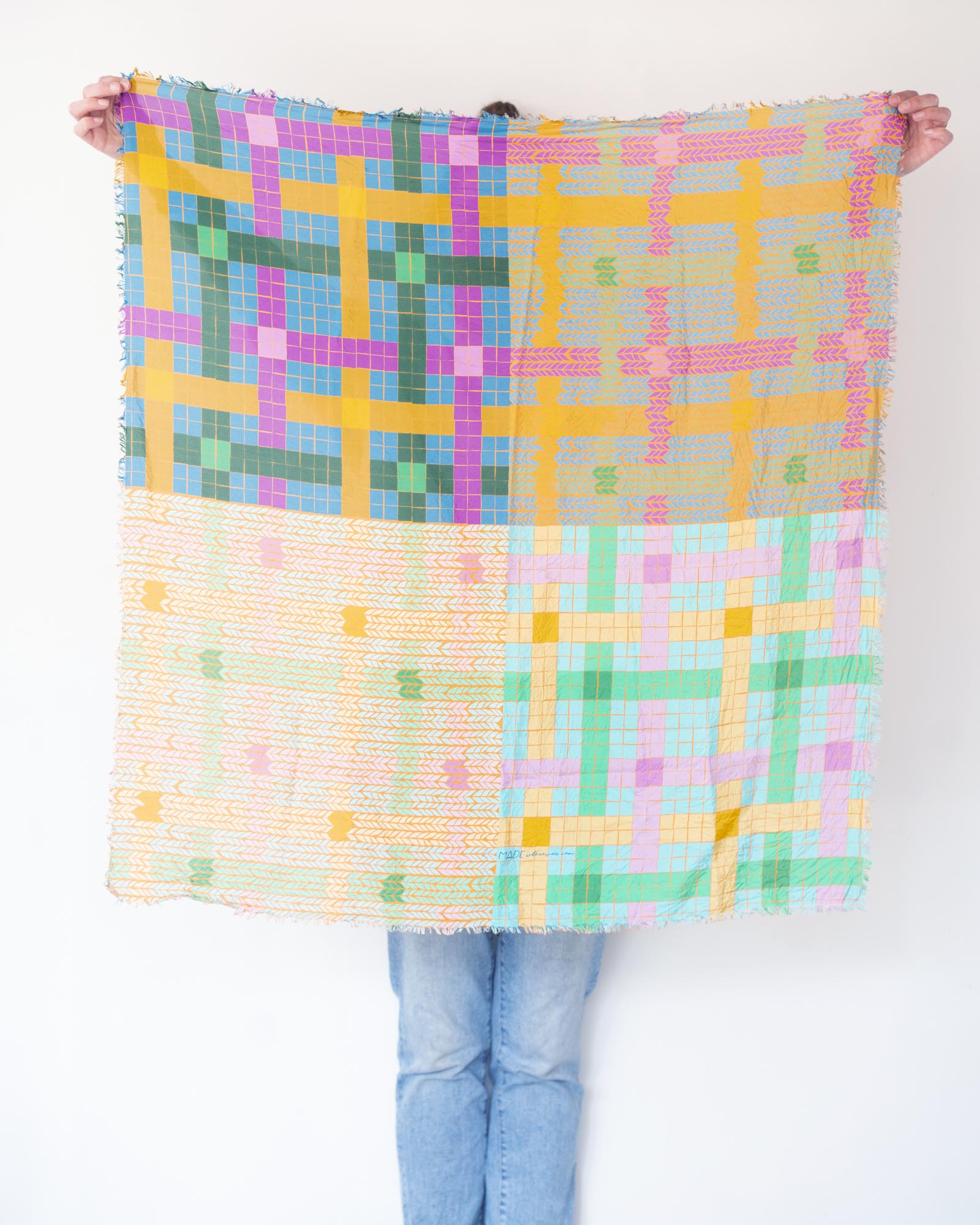 The geometric patterns were drawn by Jess, cut and fringed in Truckee, California, the fabric was printed in the UK using GOTS Ecocare certified inks.
