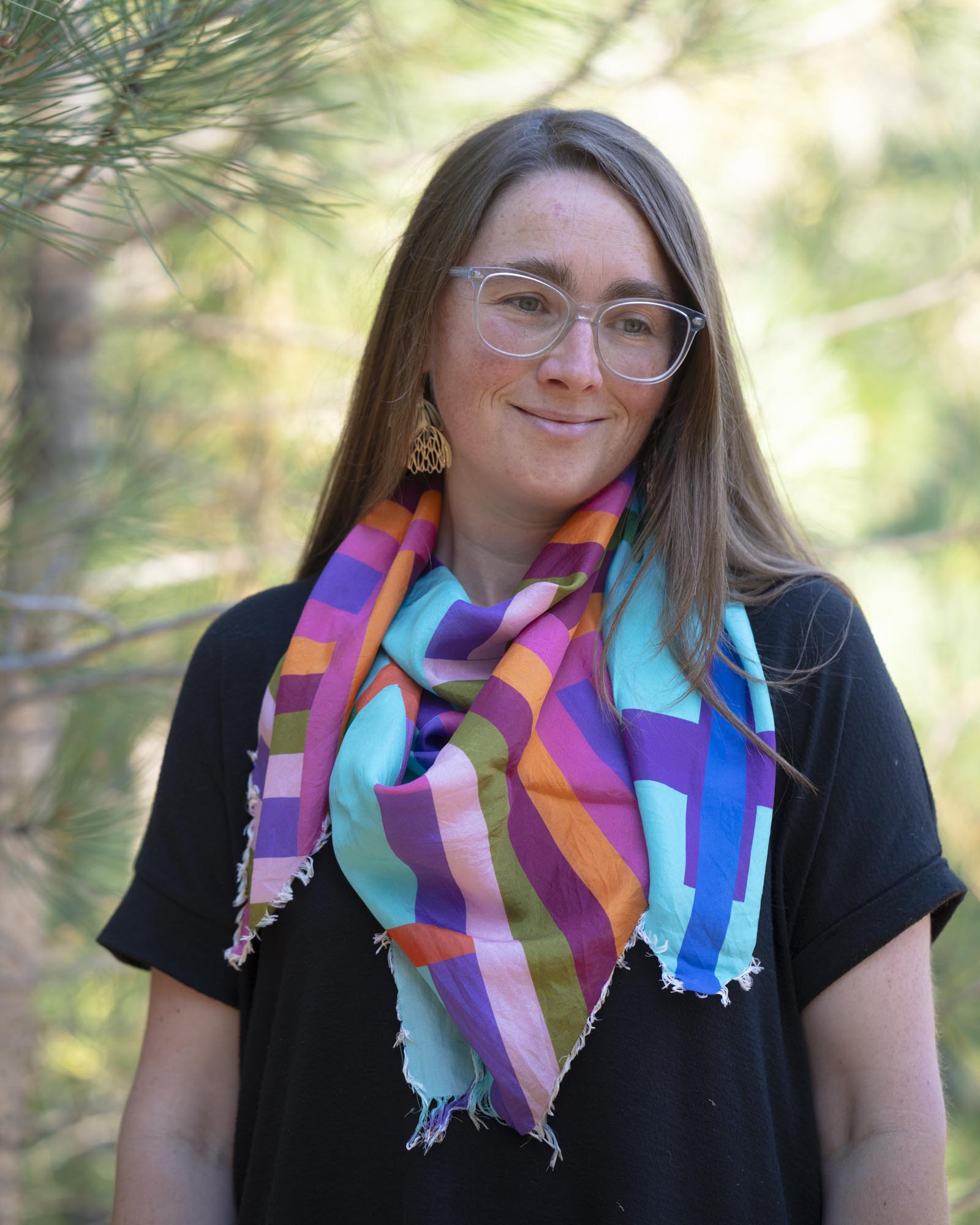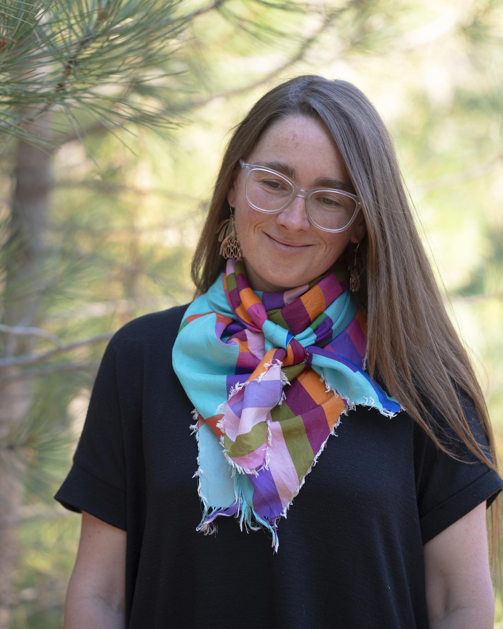 The geometric patterns were designed by Jess, cut and fringed in Truckee, California, the fabric was printed in the UK using GOTS Ecocare certified inks.