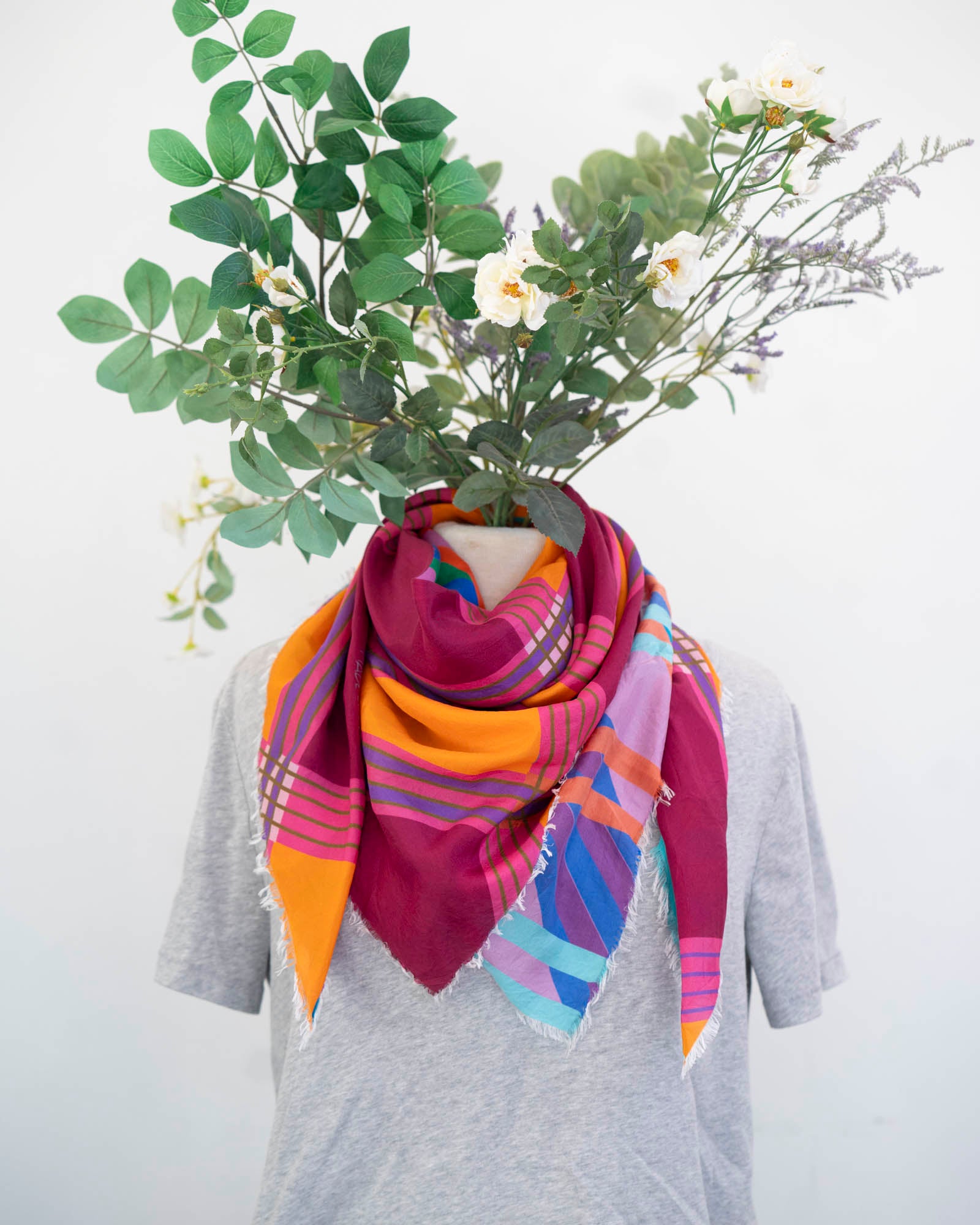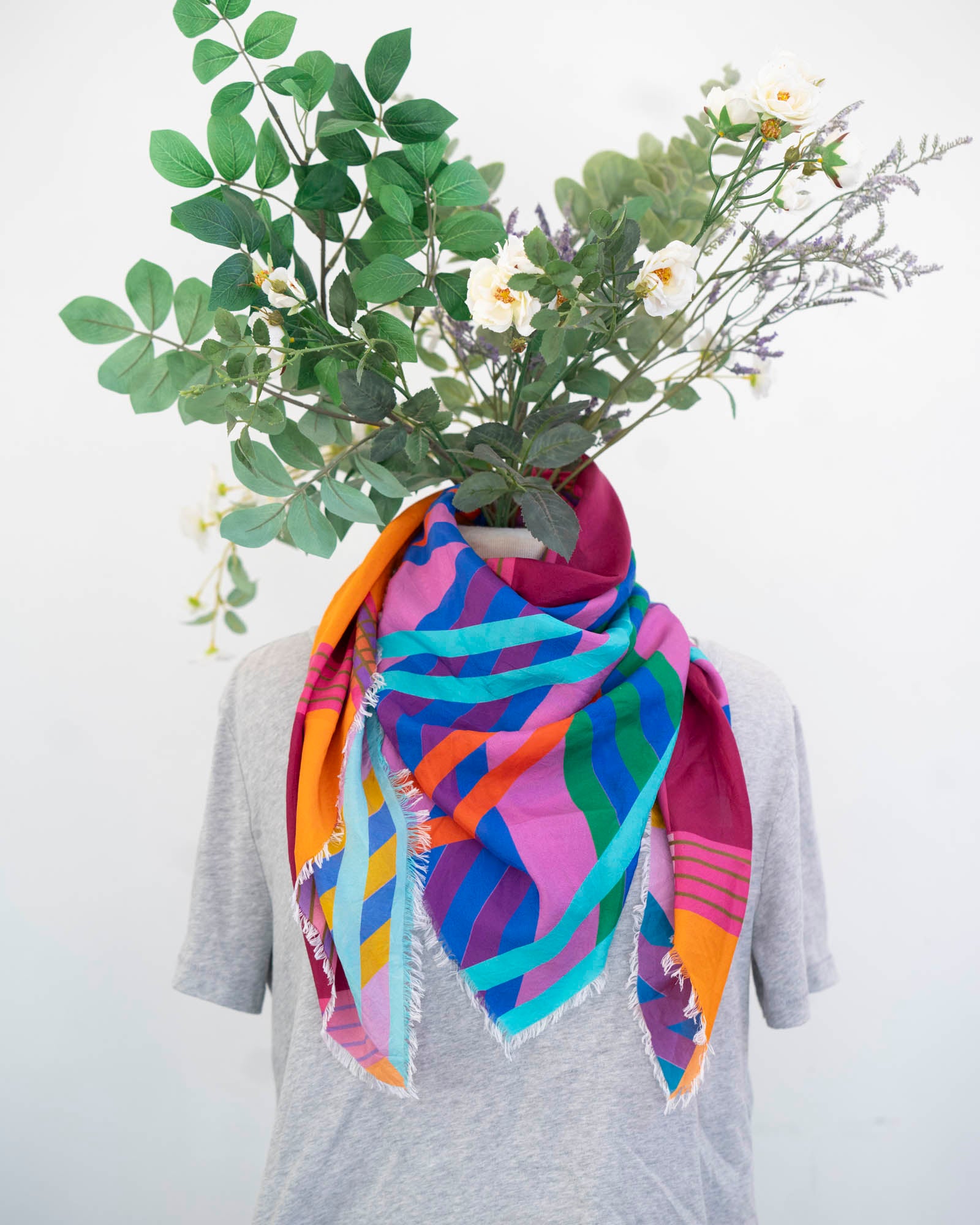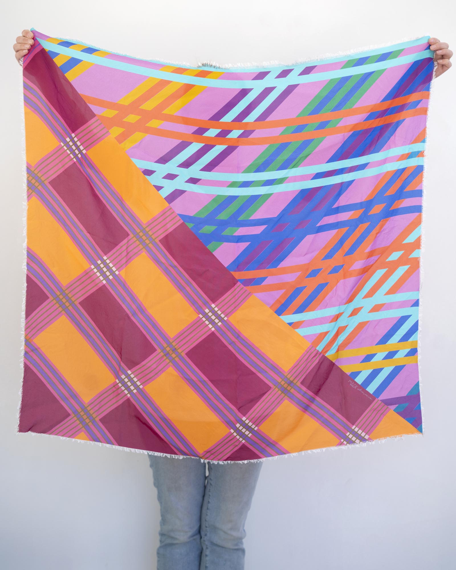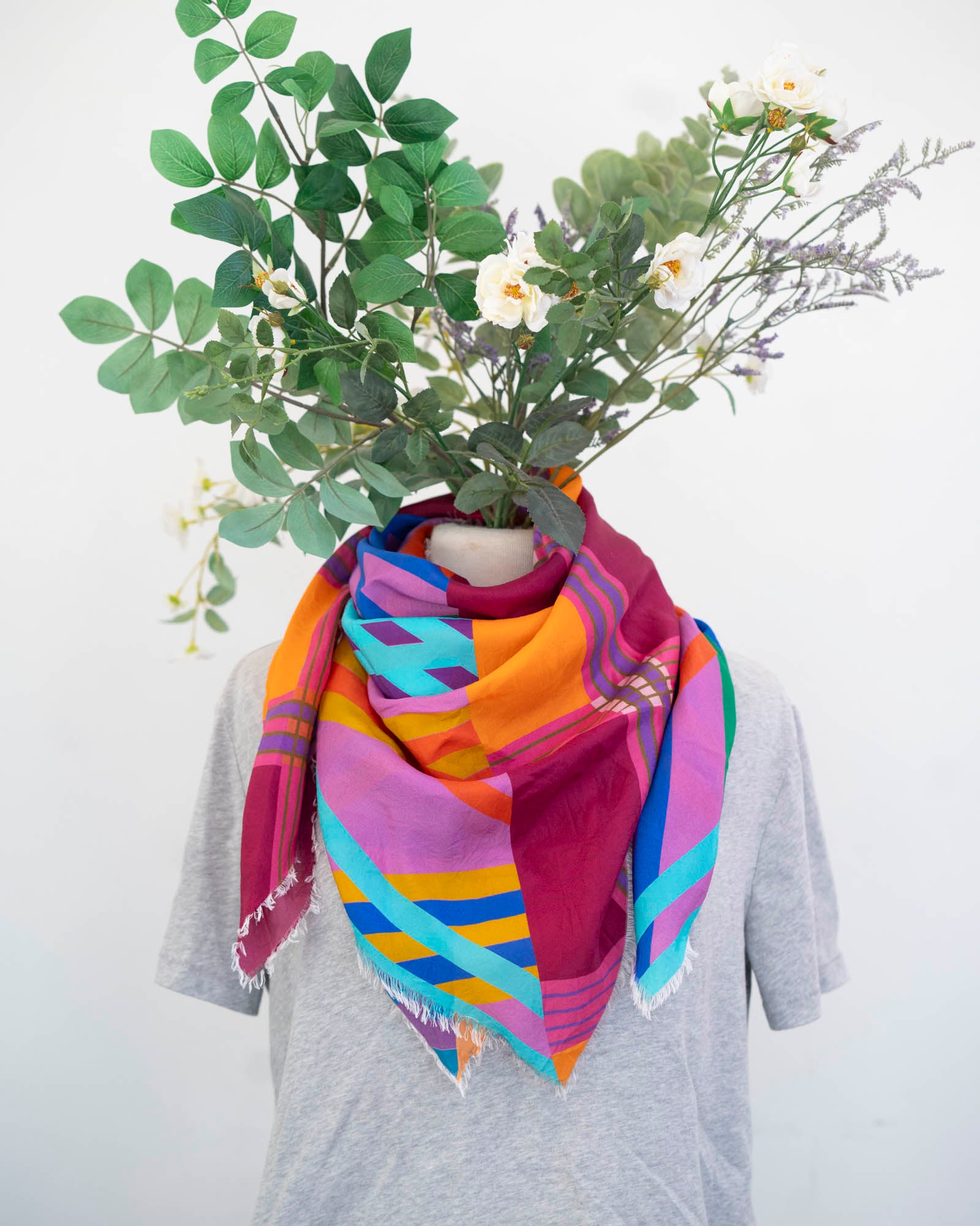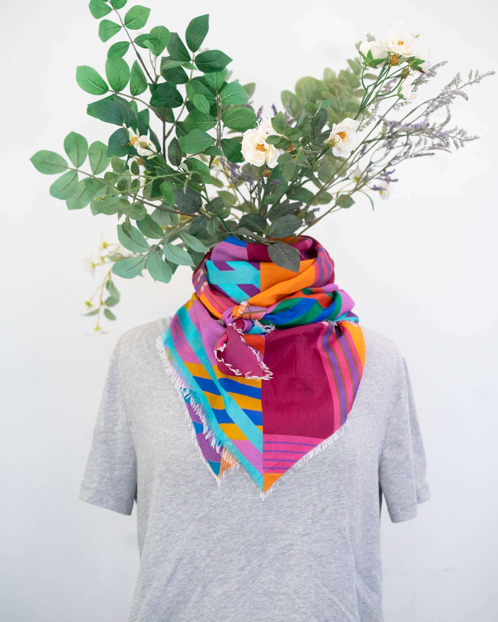 Colourful with a beautiful drape, there are so many ways to wear this scarf. Embrace the unique interplay of two totally different colour palettes and geometric designs.