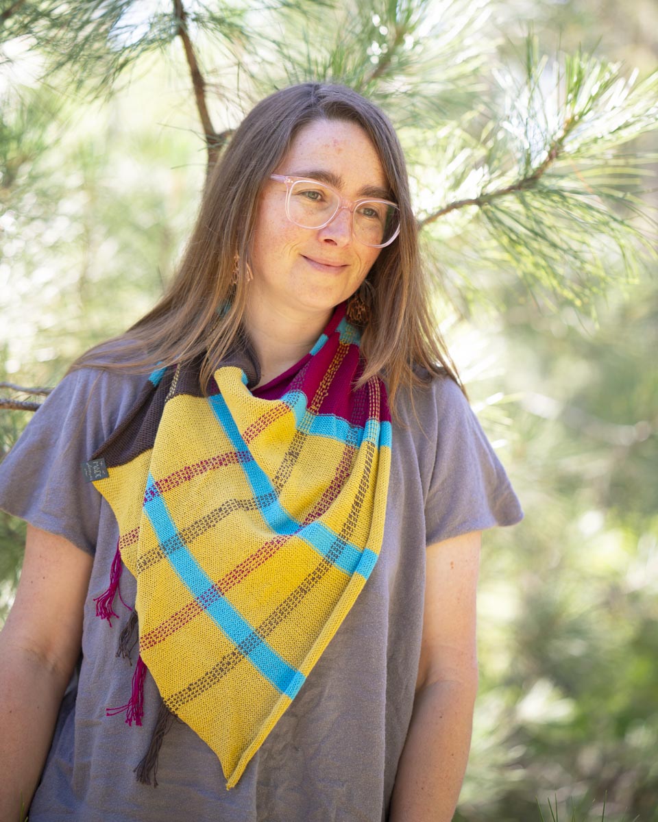 Knit on a knitting machine and then hand woven for the stripe effect.