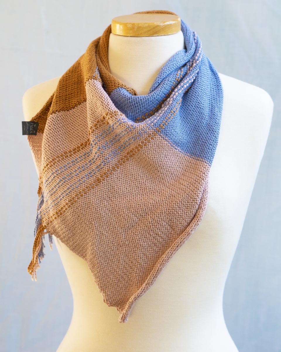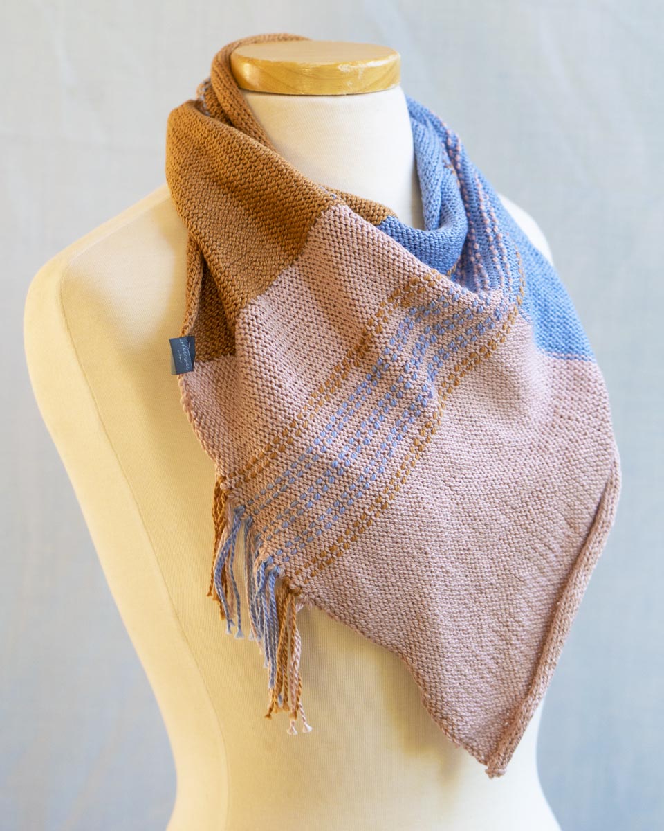 Knit on a small knitting machine and then hand woven for the checkered effect. This scarf is yellow, blue and tan.