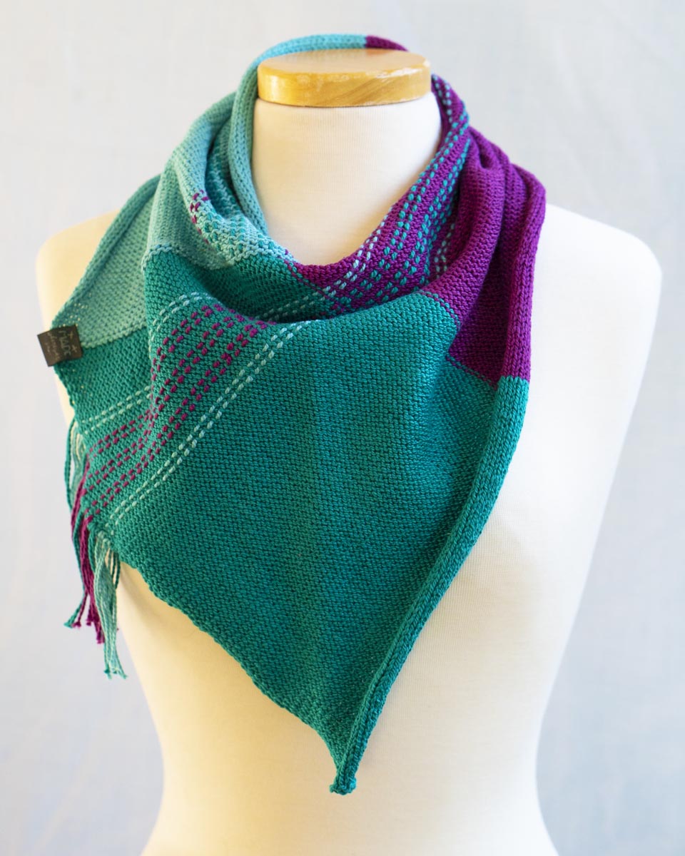 Knit on a small knitting machine and then hand woven for the checkered effect. This scarf is blue, magenta and green.