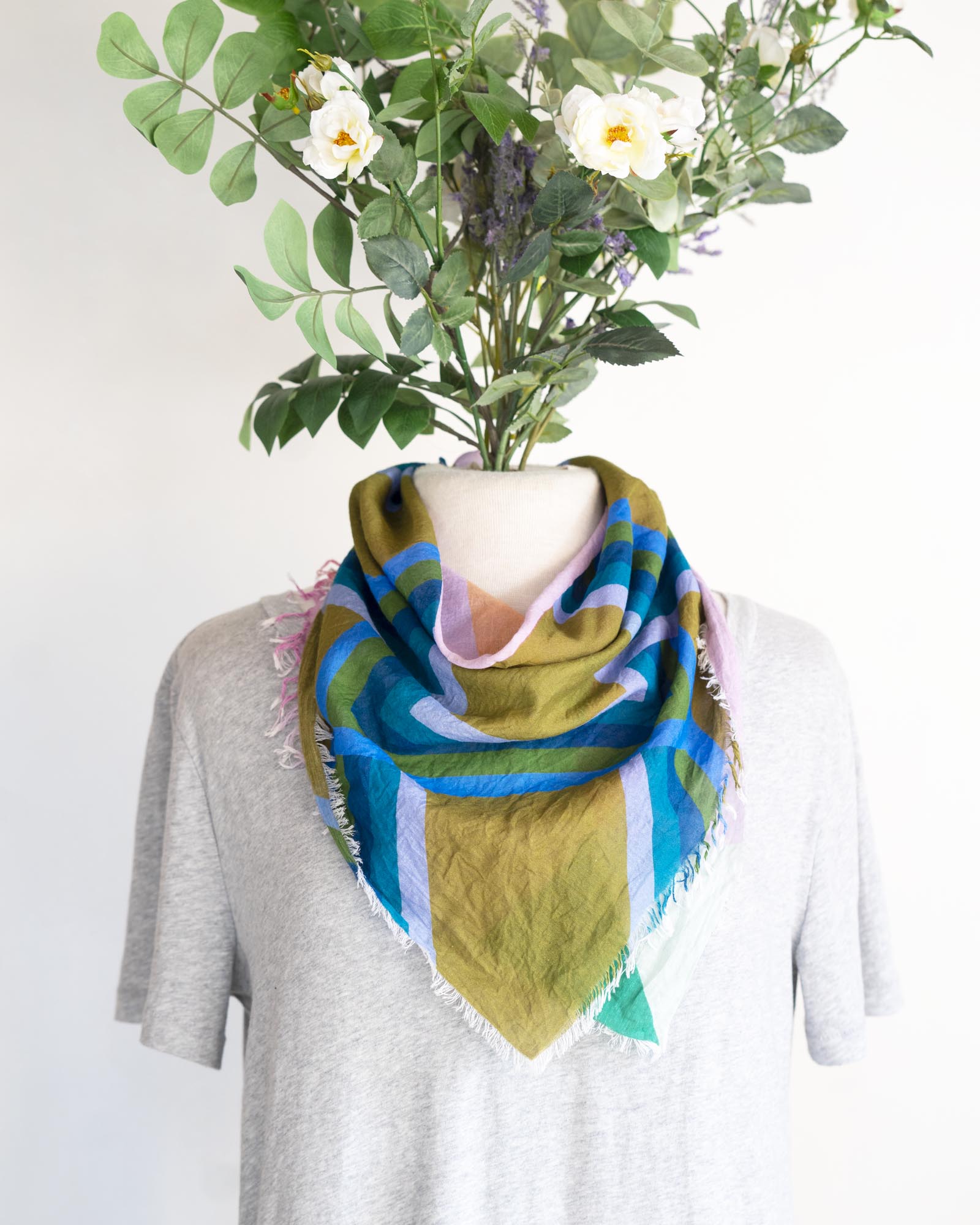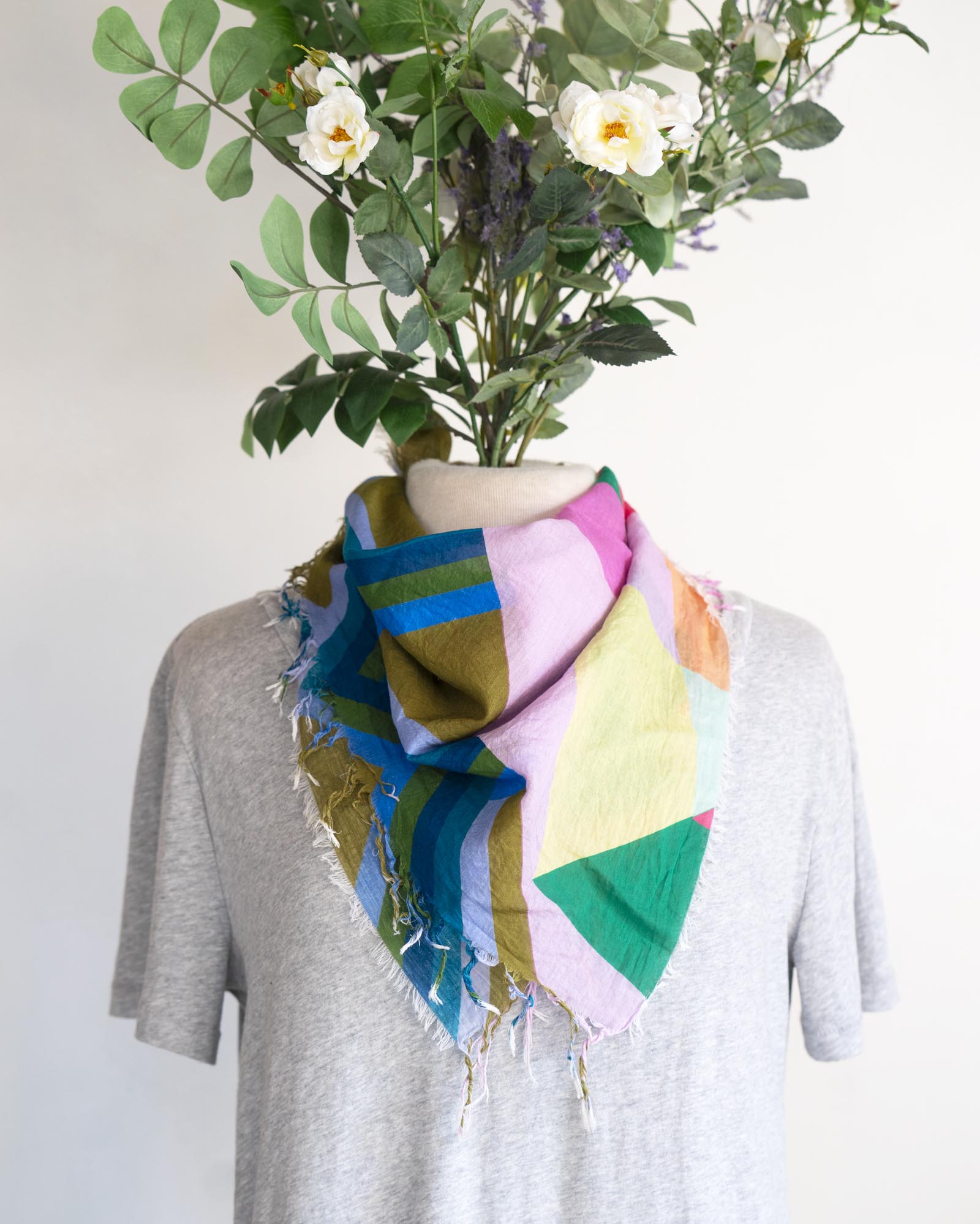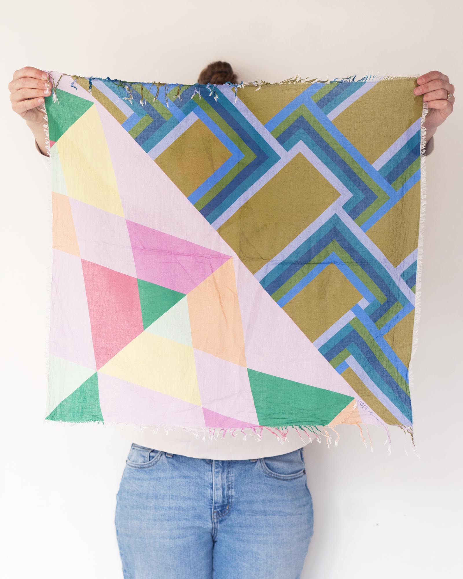 The geometric patterns were drawn by Jess, cut and fringed in Truckee, California, the fabric was printed in the UK using GOTS Ecocare certified inks.