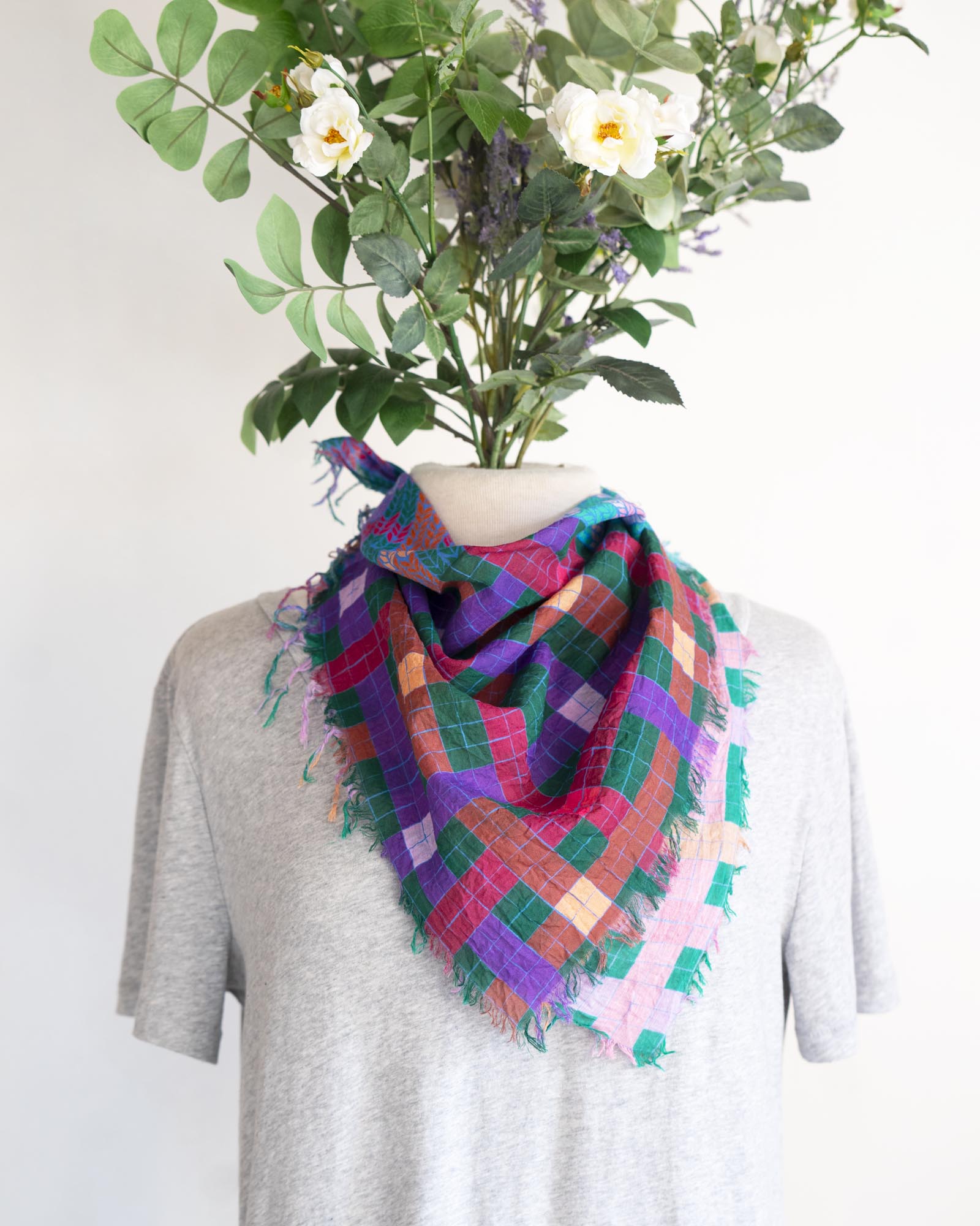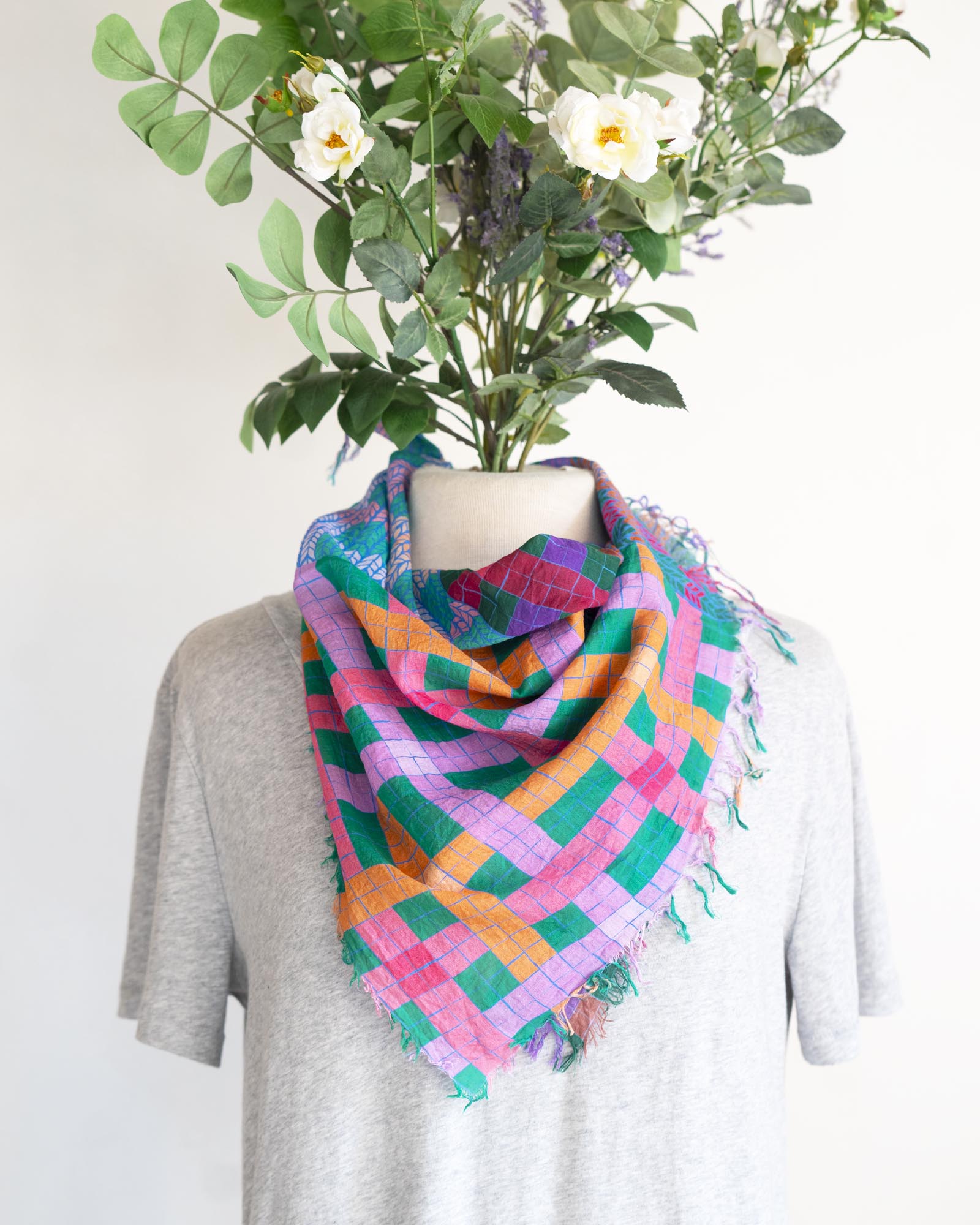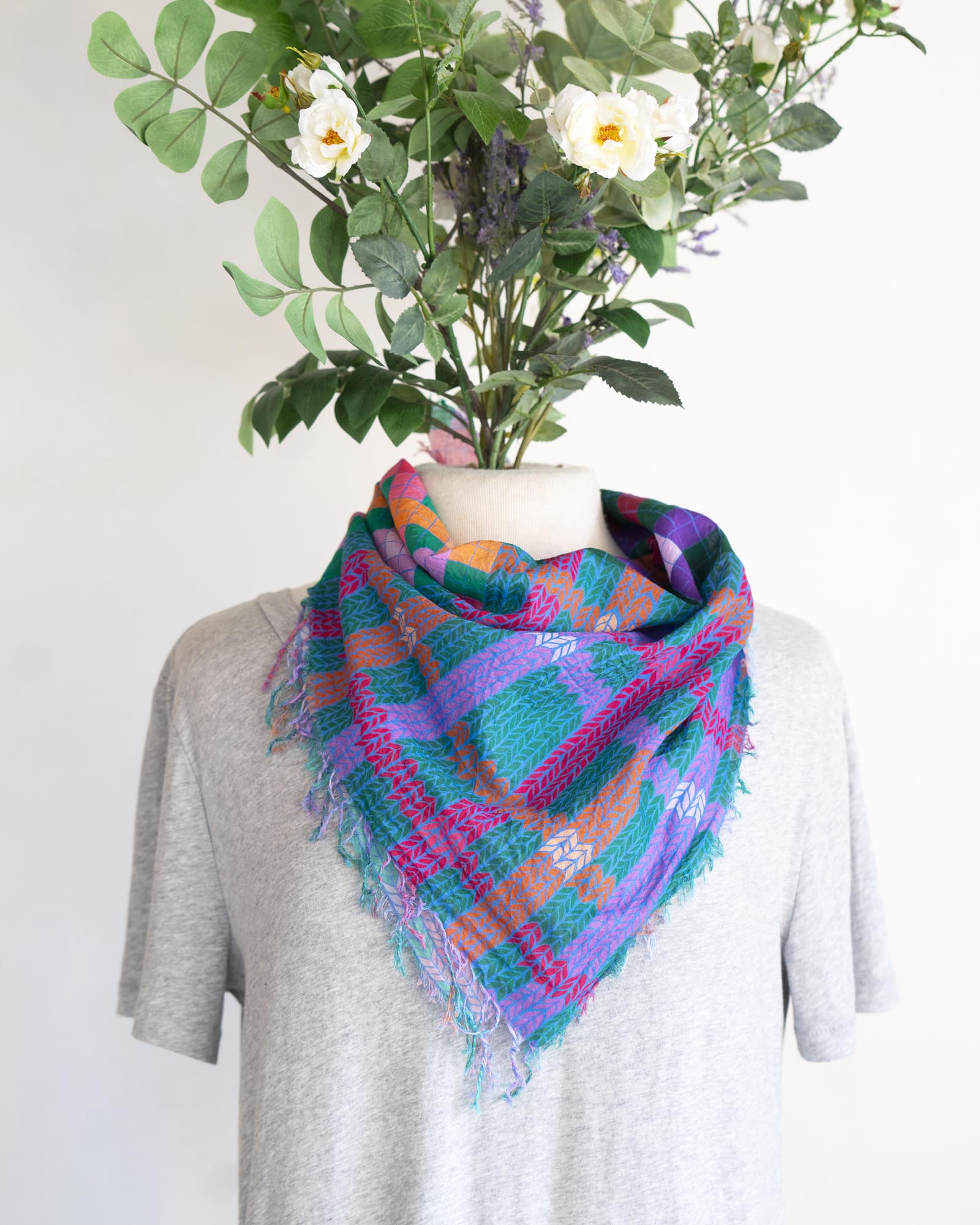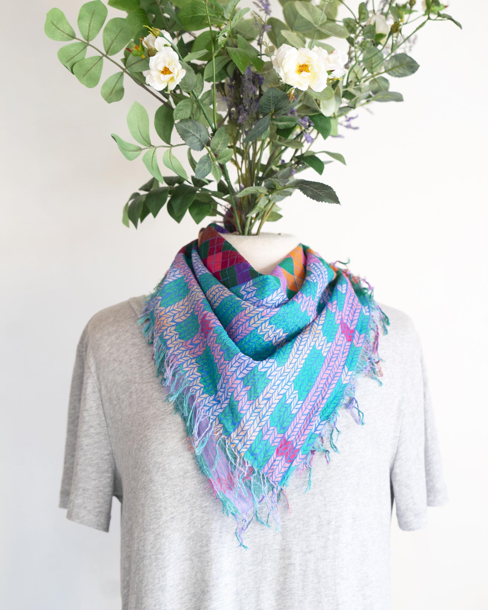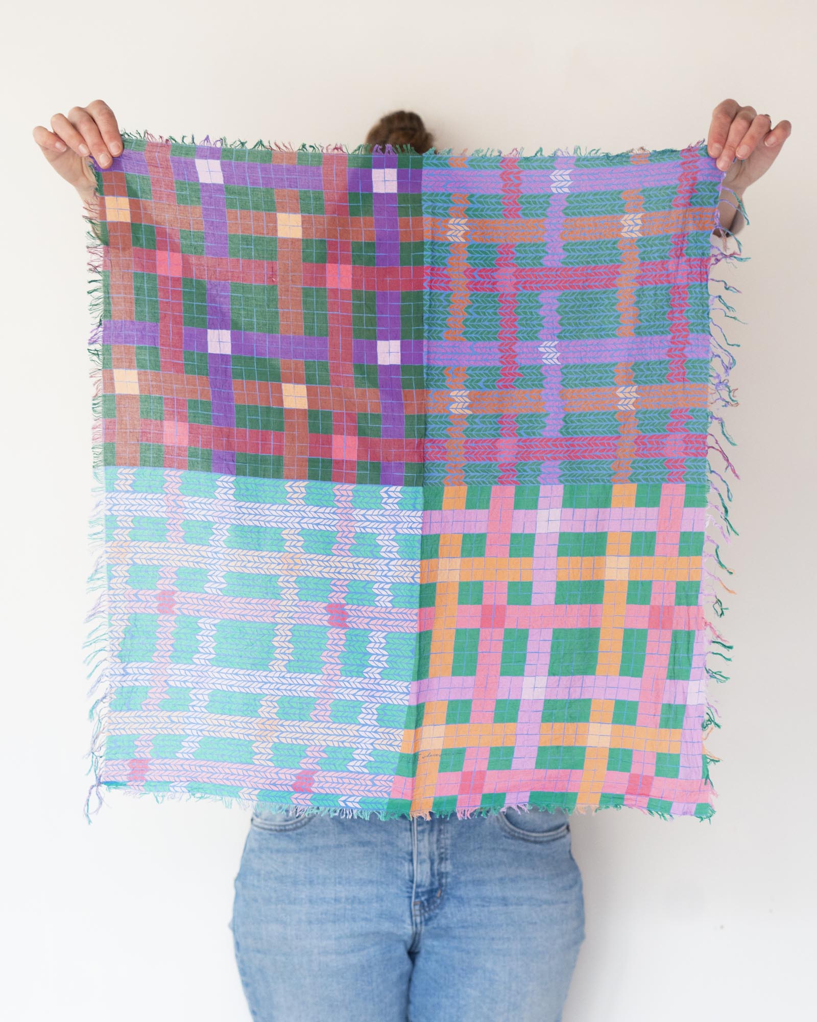 The geometric patterns were drawn by Jess, cut and fringed in Truckee, California, the fabric was printed in the UK using GOTS Ecocare certified inks.