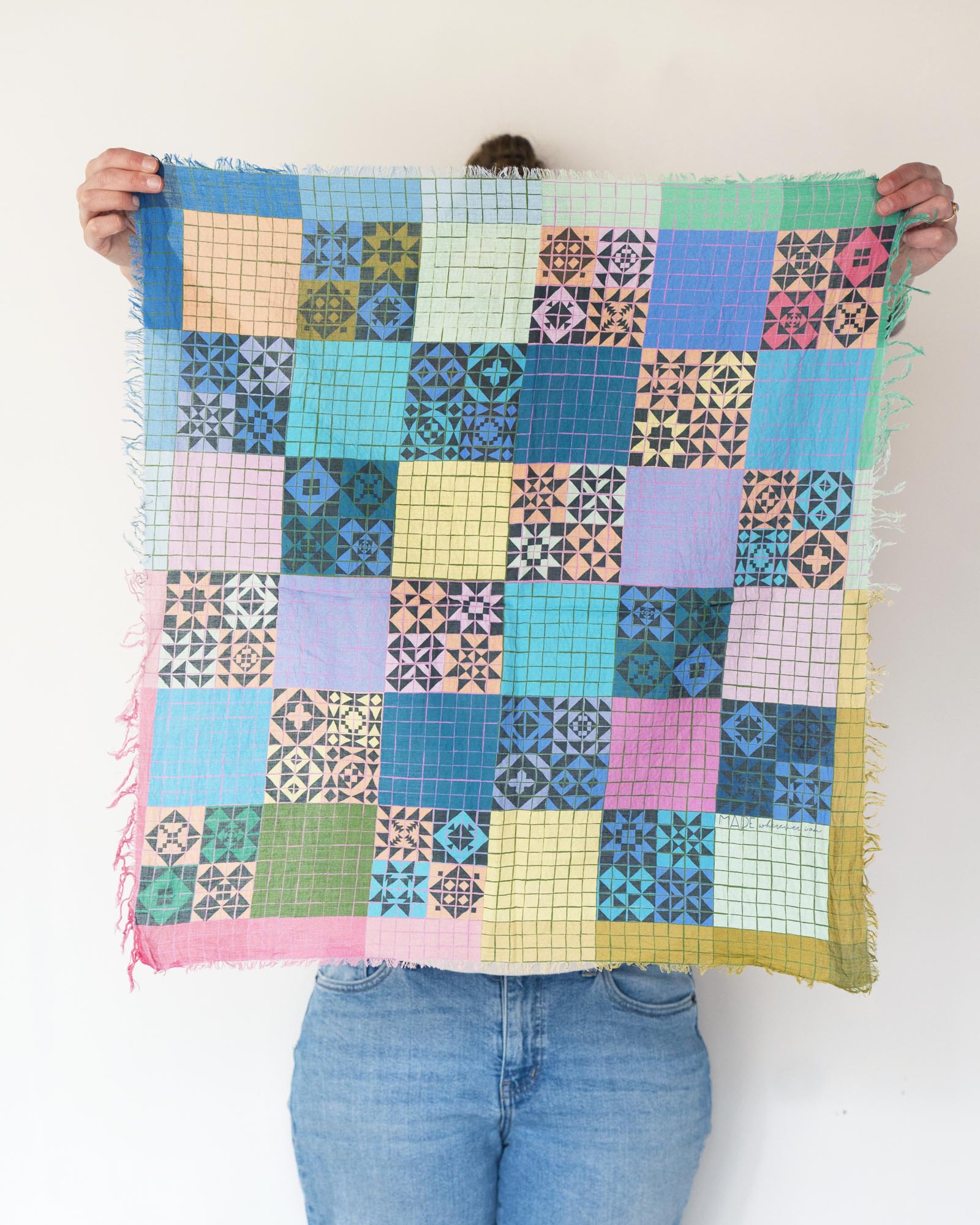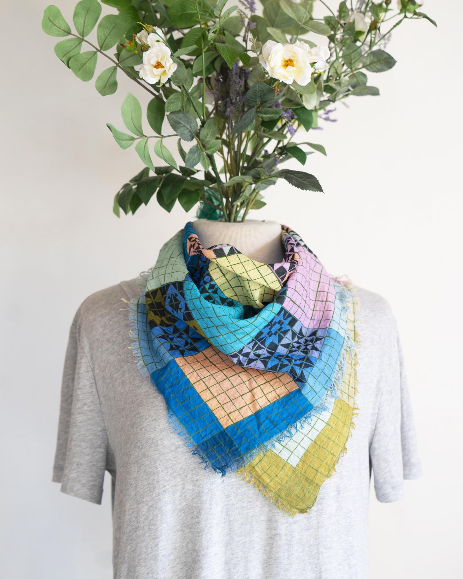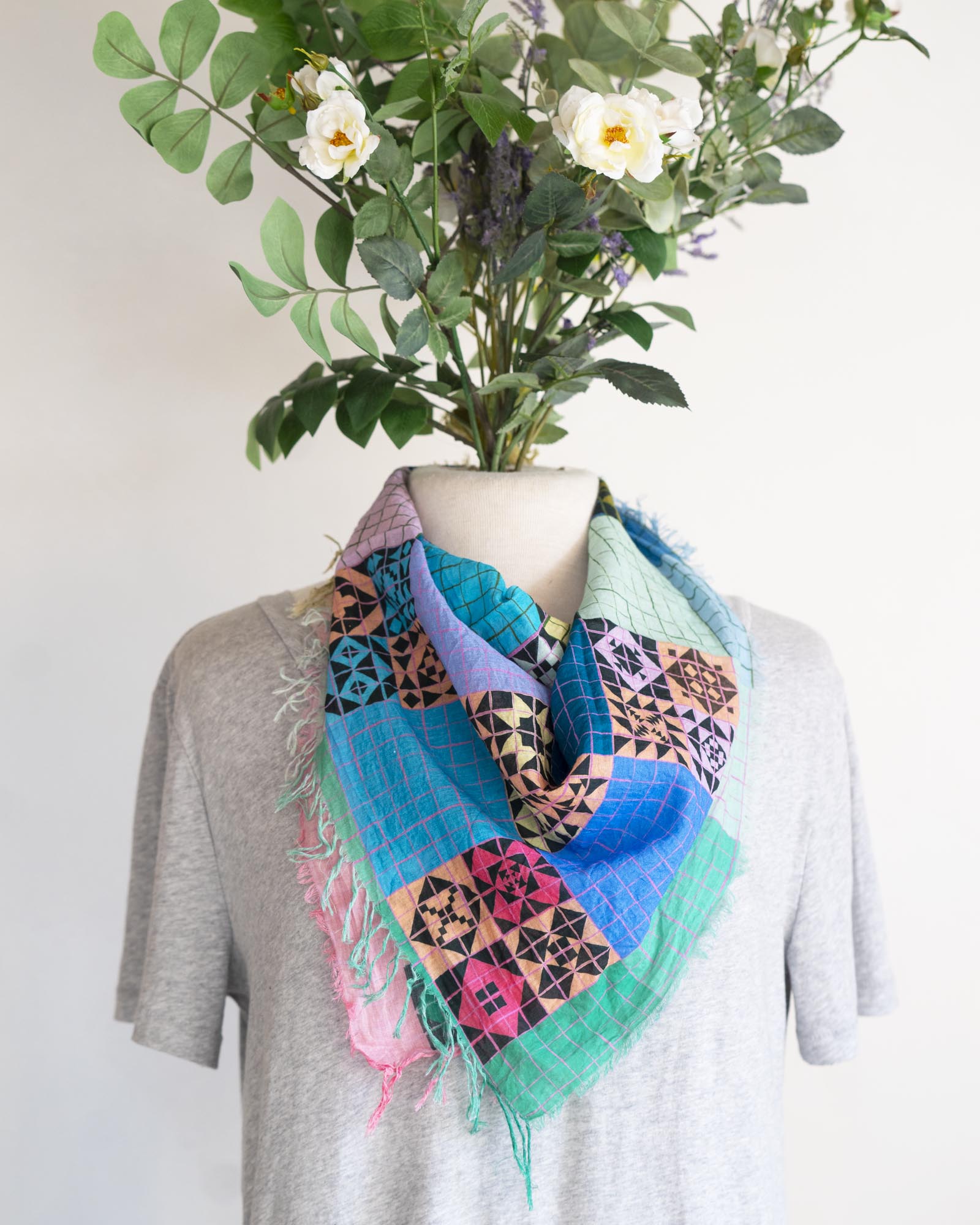 Inspired by patchwork, there are so many ways to wear this colourful and lightweight scarf. You can style it to emphasise different colour combinations depending on your mood.