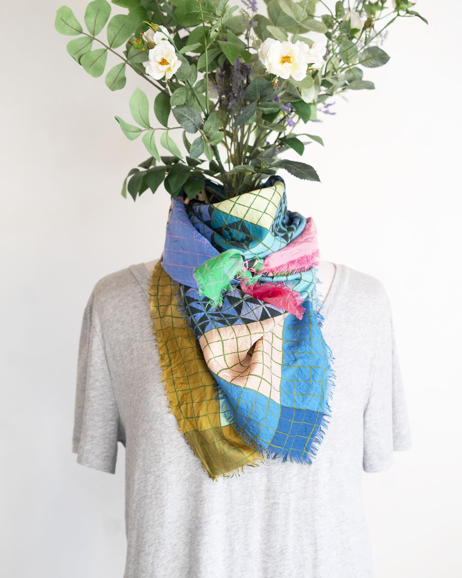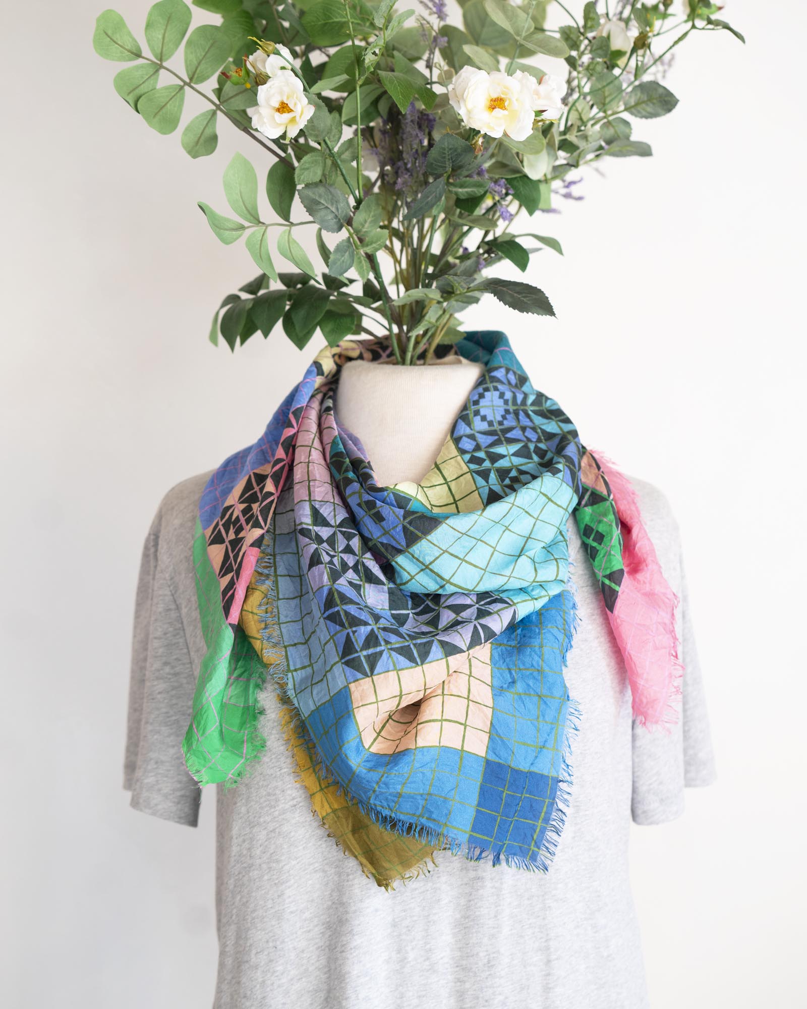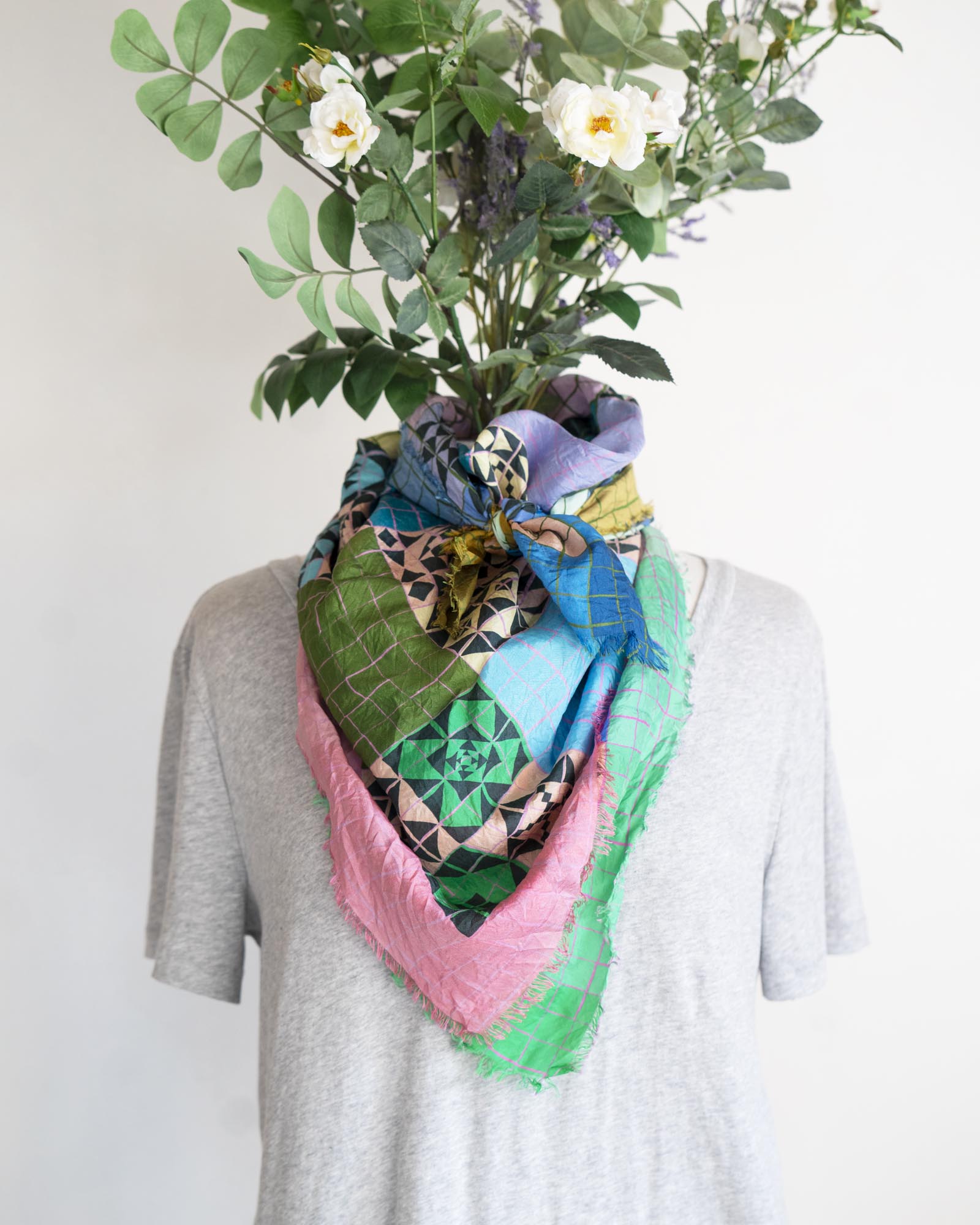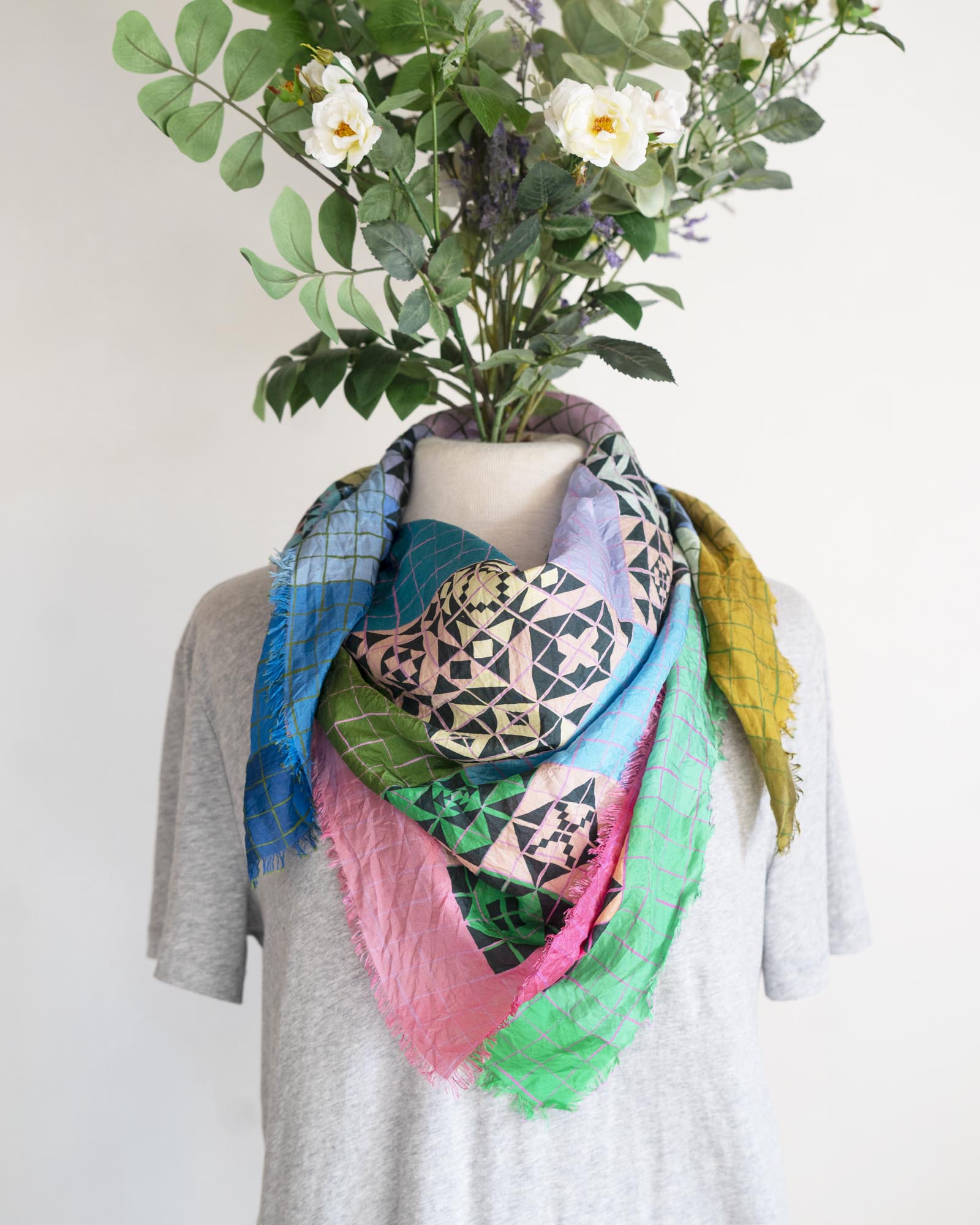 Inspired by patchwork, there are so many ways to wear this colourful and lightweight scarf. You can style it to emphasise different colour combinations depending on your mood.