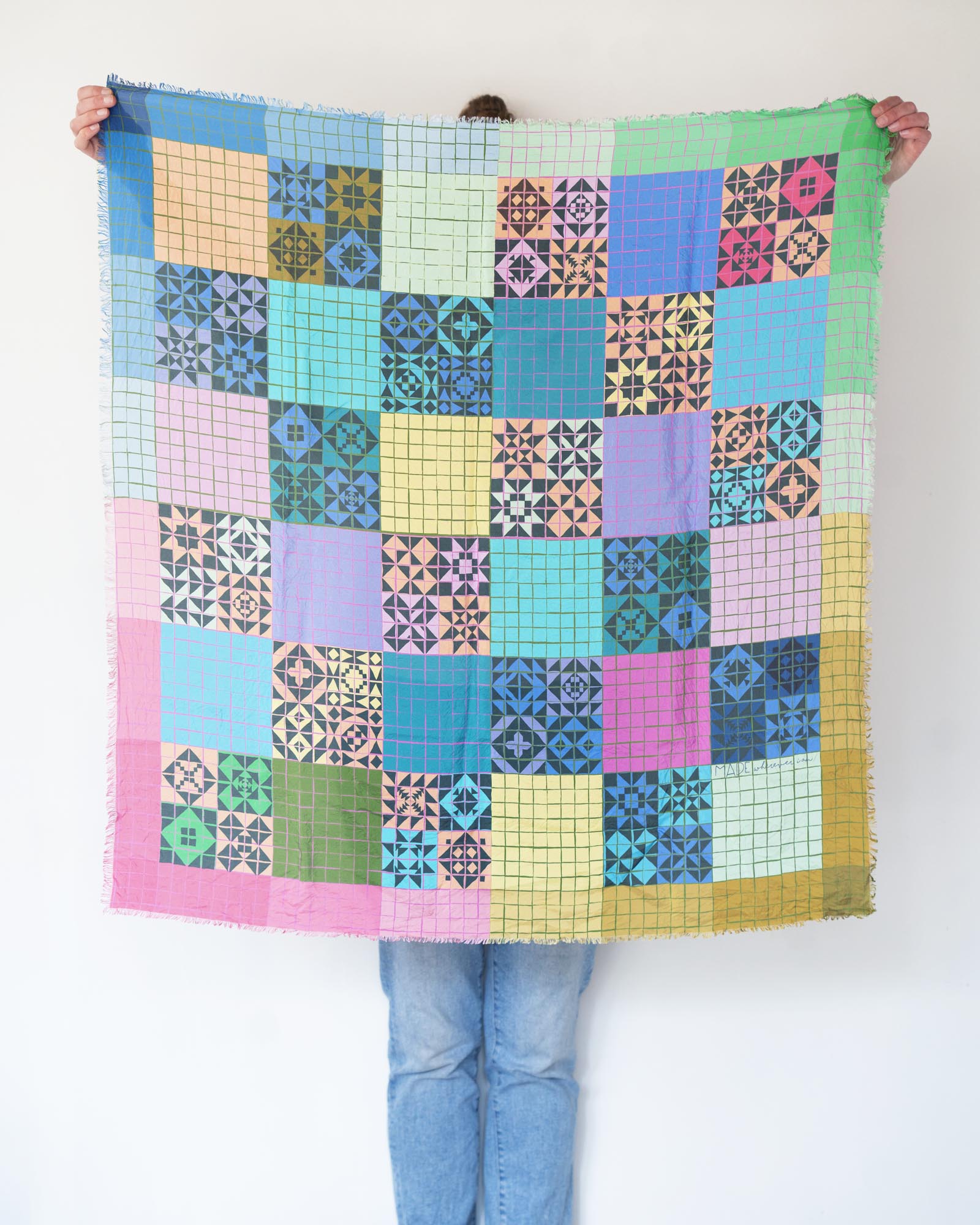 The geometric patterns were drawn by Jess, cut and fringed in Truckee, California, the fabric was printed in the UK using GOTS Ecocare certified inks.