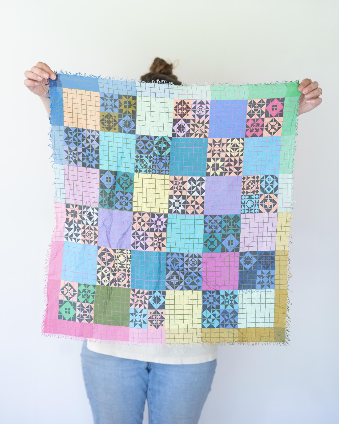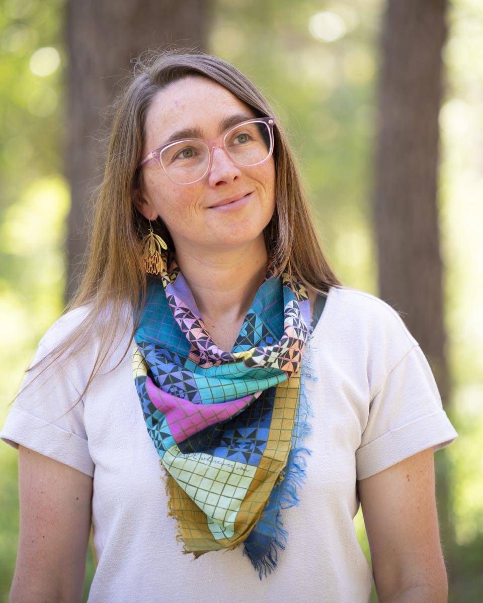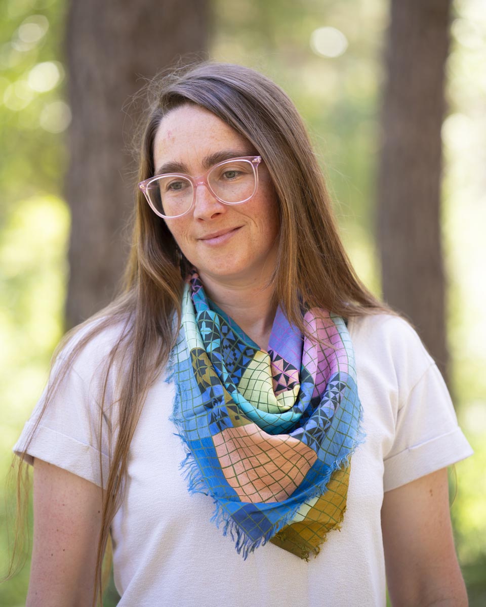 The geometric patterns were designed by Jess, cut and fringed in Truckee, California, the fabric was printed in the UK using GOTS Ecocare certified inks.