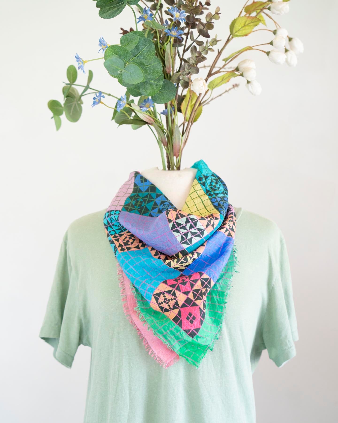 Inspired by patchwork and filled with colour, there are so many ways to wear this scarf. You can style it to emphasise different colour combinations depending on your mood.