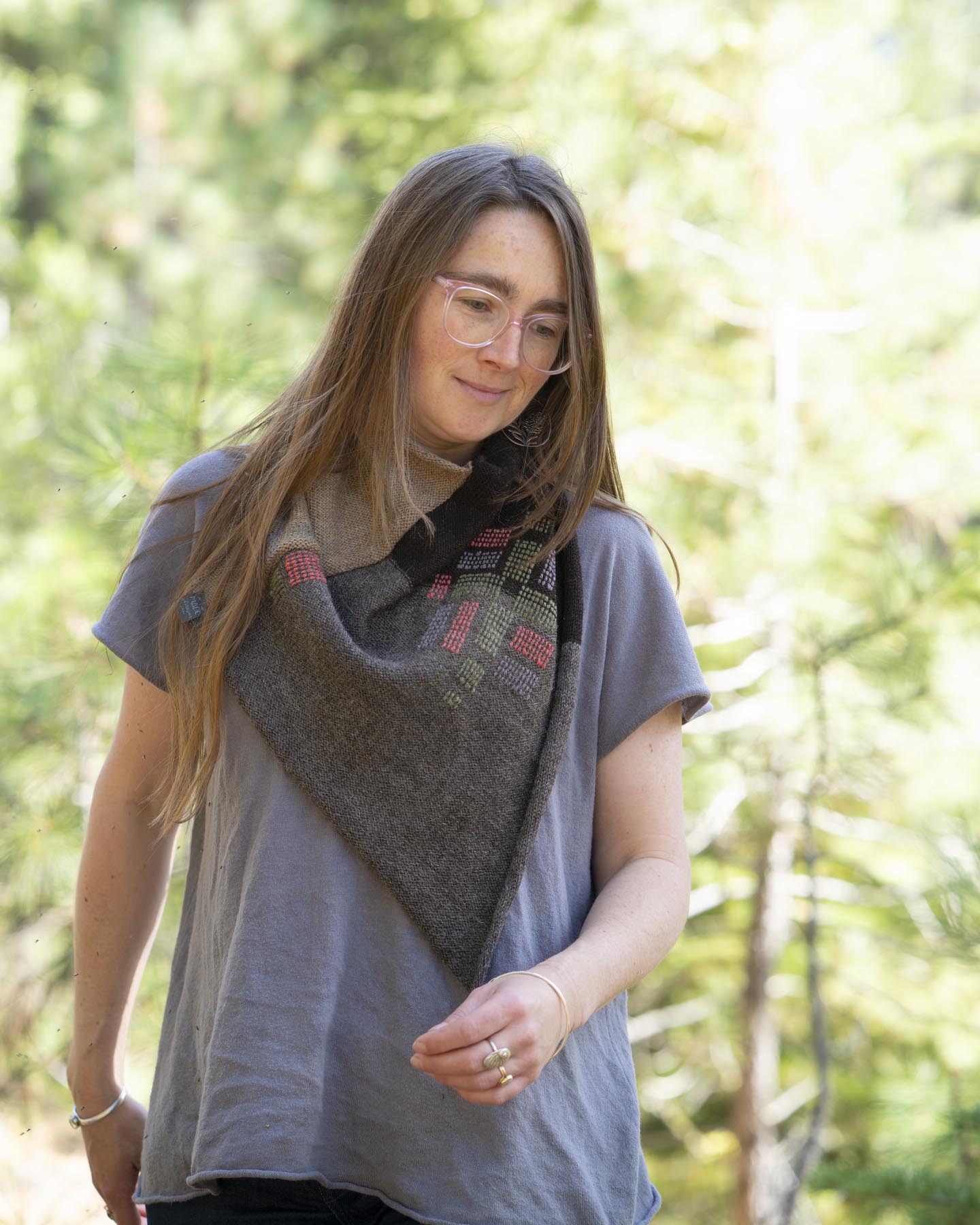 It is made from 100% naturally coloured wool. Knit from a light and rustic yarn from the Shetland Islands which is completely undyed, highlighting the natural colours of the sheep's fleece. The woven design is created using a Cormo yarn, naturally dyed in Northern California for a bright and colourful contrast.