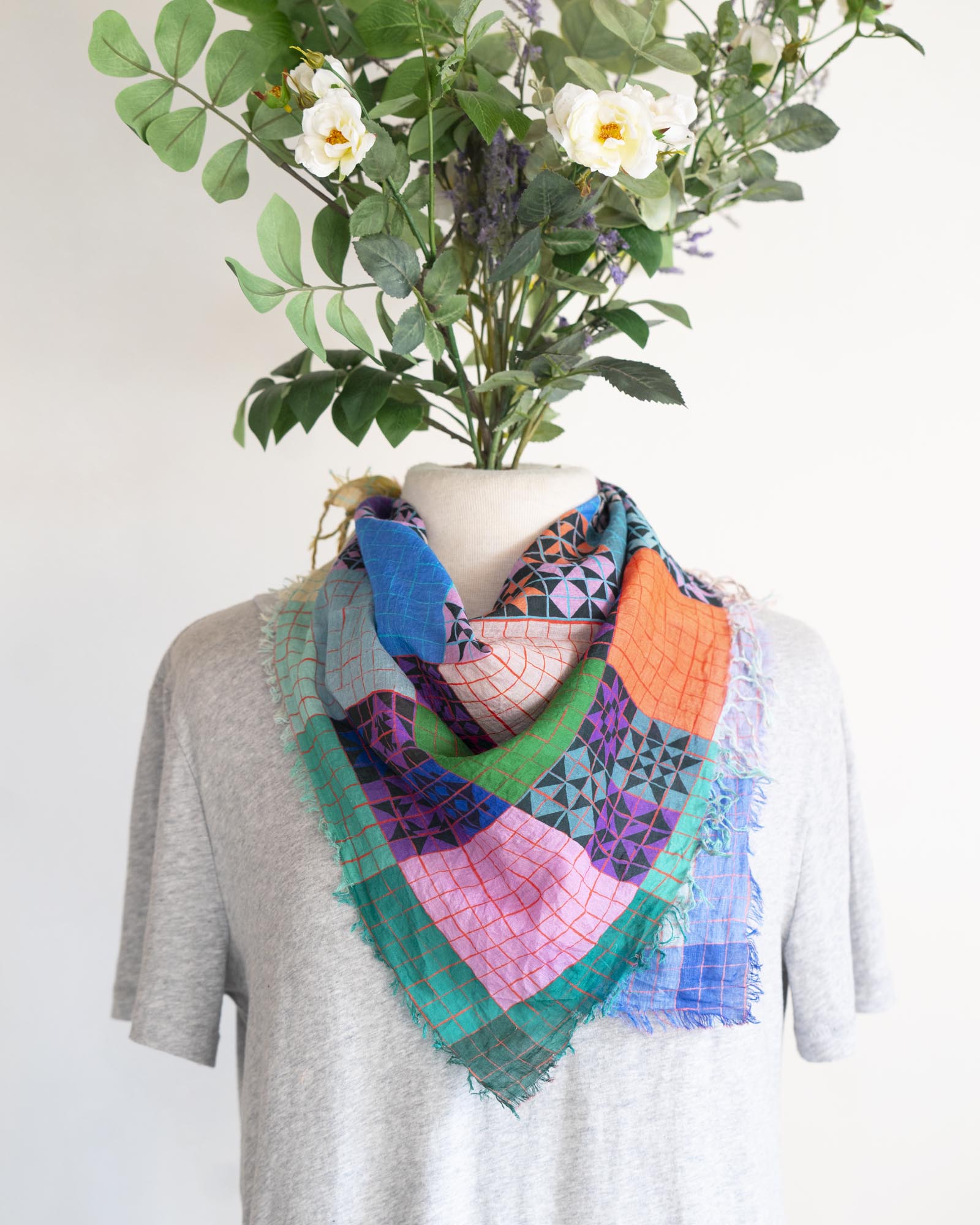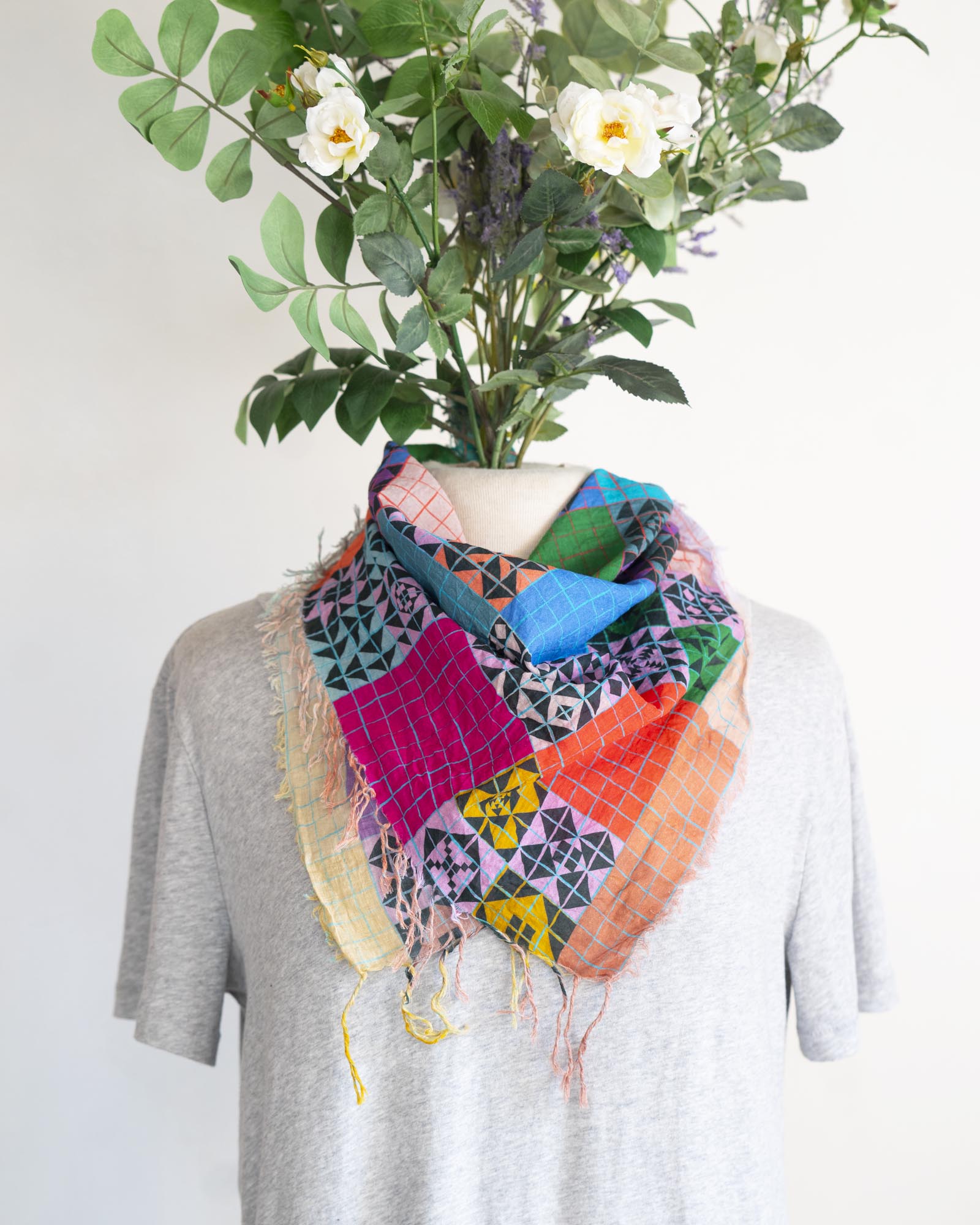 Inspired by patchwork, there are so many ways to wear this colourful and lightweight scarf. You can style it to emphasise different colour combinations depending on your mood.