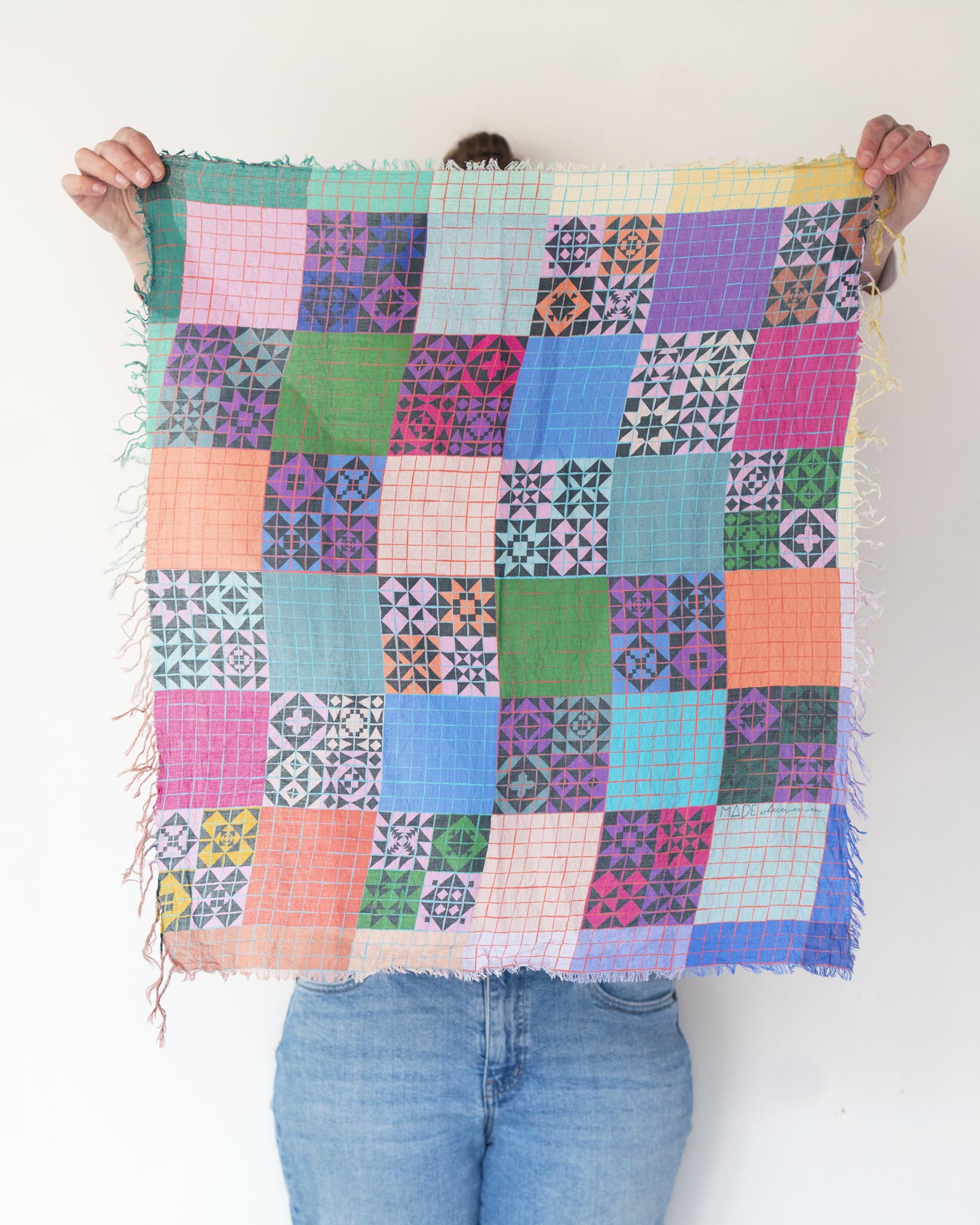 The geometric patterns were drawn by Jess, cut and fringed in Truckee, California, the fabric was printed in the UK using GOTS Ecocare certified inks.