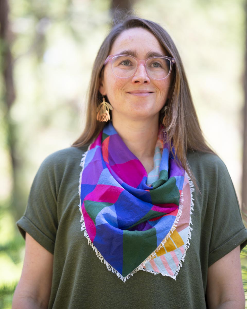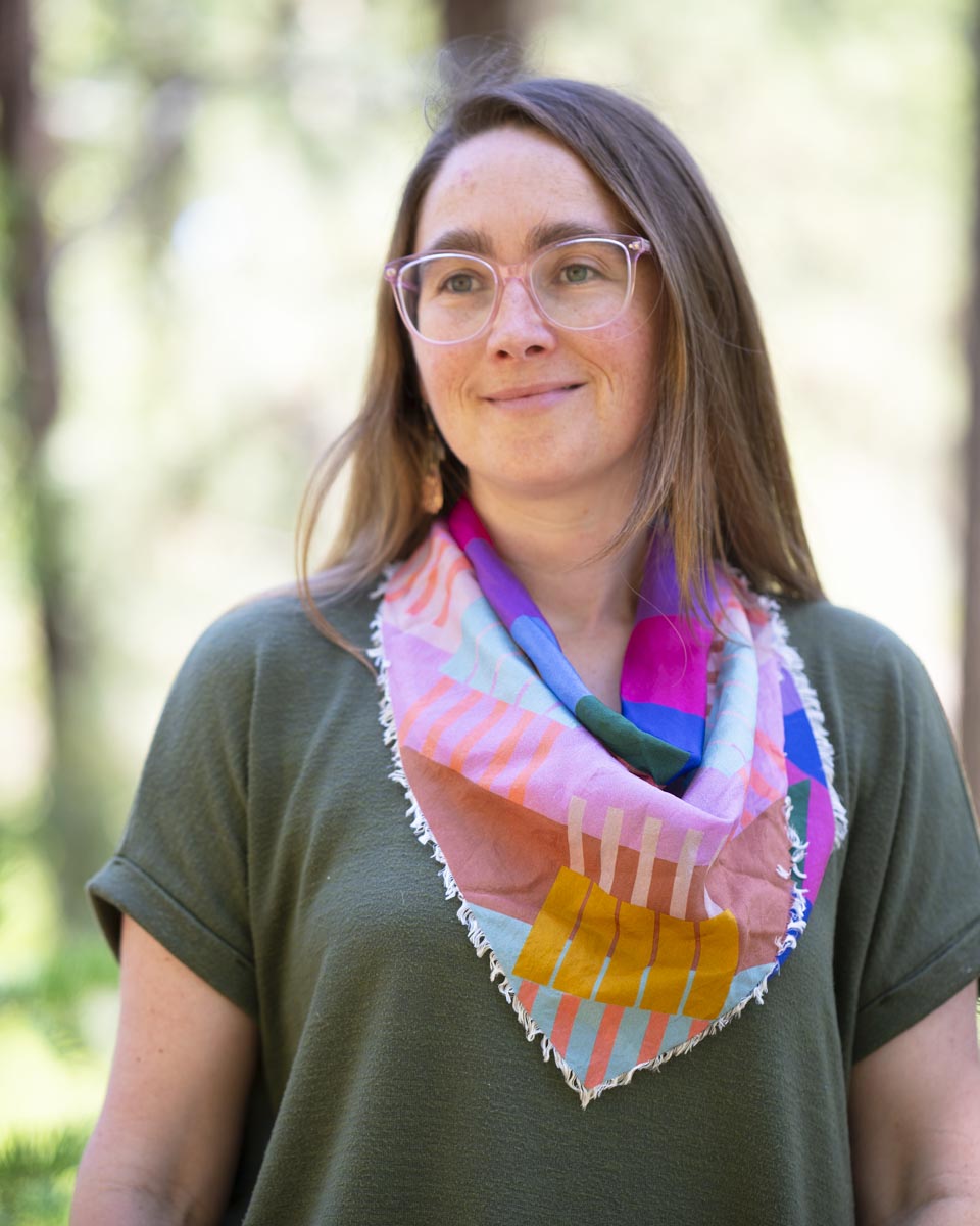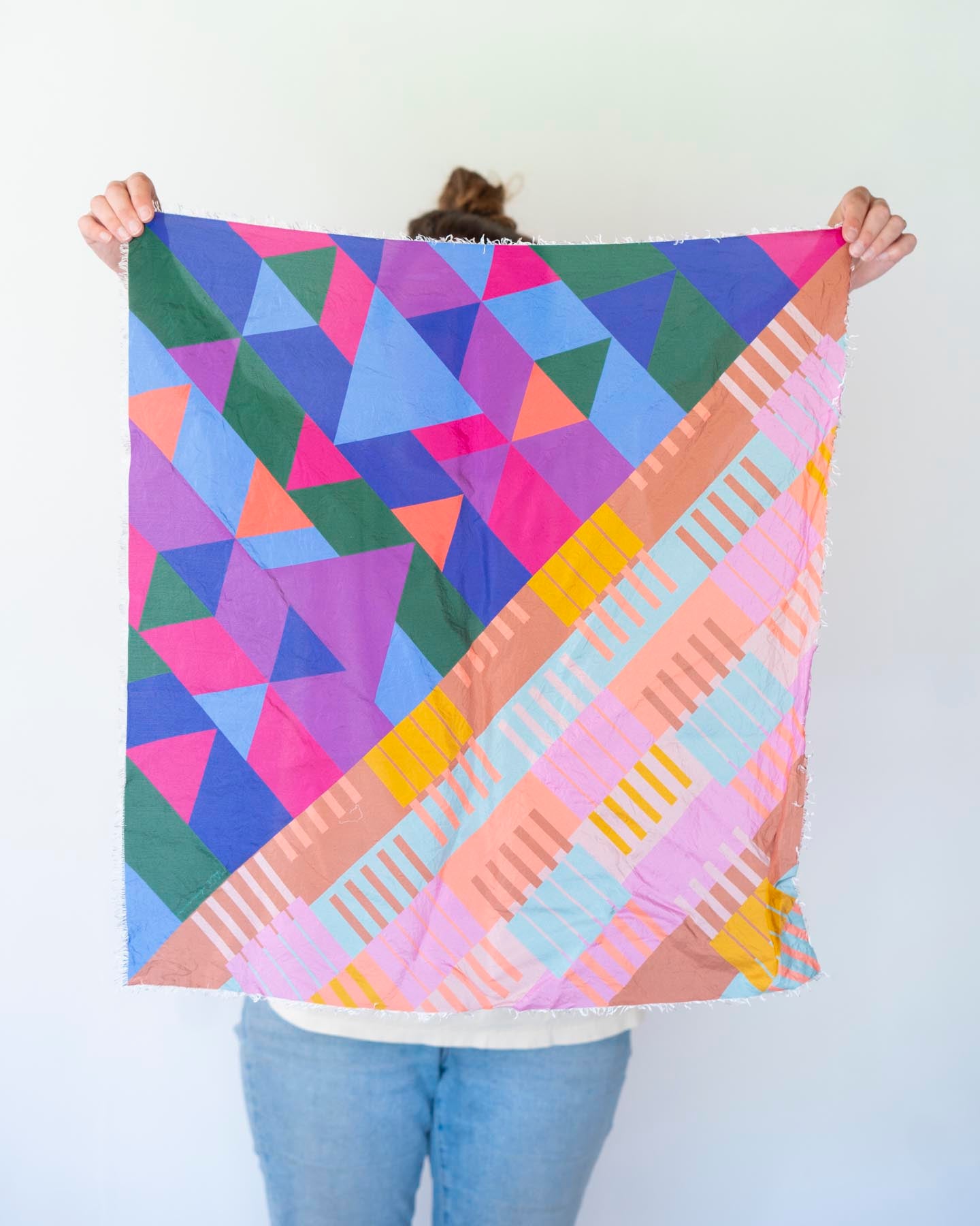 The geometric patterns were designed by Jess, cut and fringed in Truckee, California, the fabric was printed in the UK using GOTS Ecocare certified inks.
