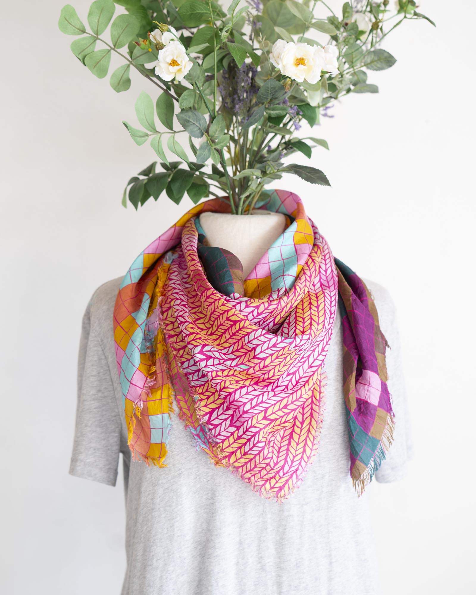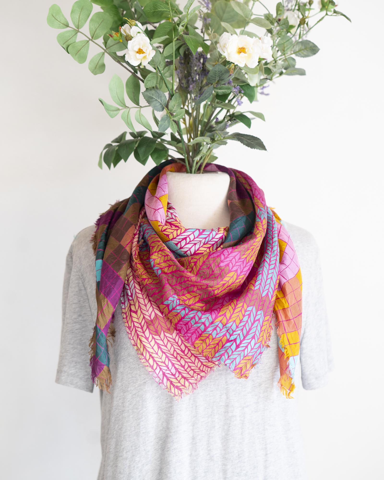 The geometric patterns were drawn by Jess, cut and fringed in Truckee, California, the fabric was printed in the UK using GOTS Ecocare certified inks.