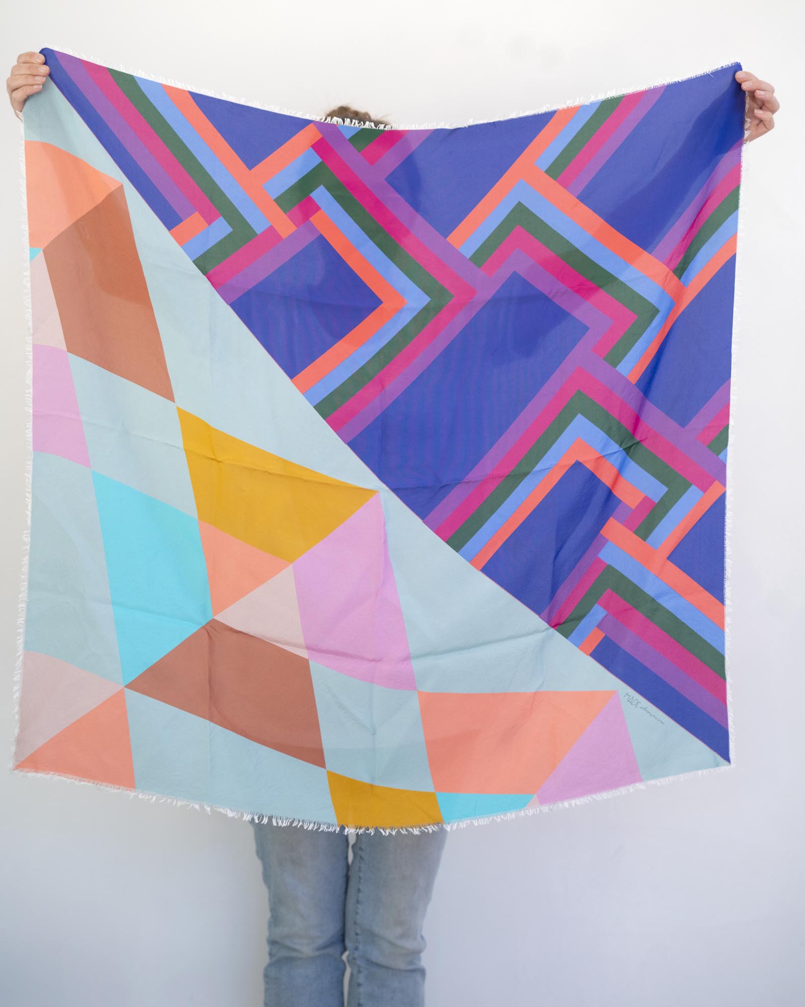 The geometric patterns were designed by Jess, cut and fringed in Truckee, California, the fabric was printed in the UK using GOTS Ecocare certified inks.