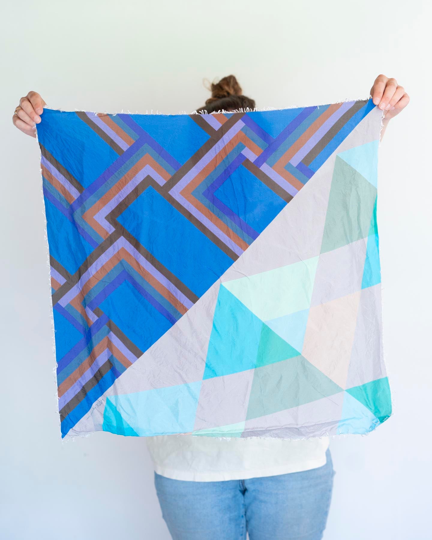 The geometric patterns were designed by Jess, cut and fringed in Truckee, California, the fabric was printed in the UK using GOTS Ecocare certified inks.
