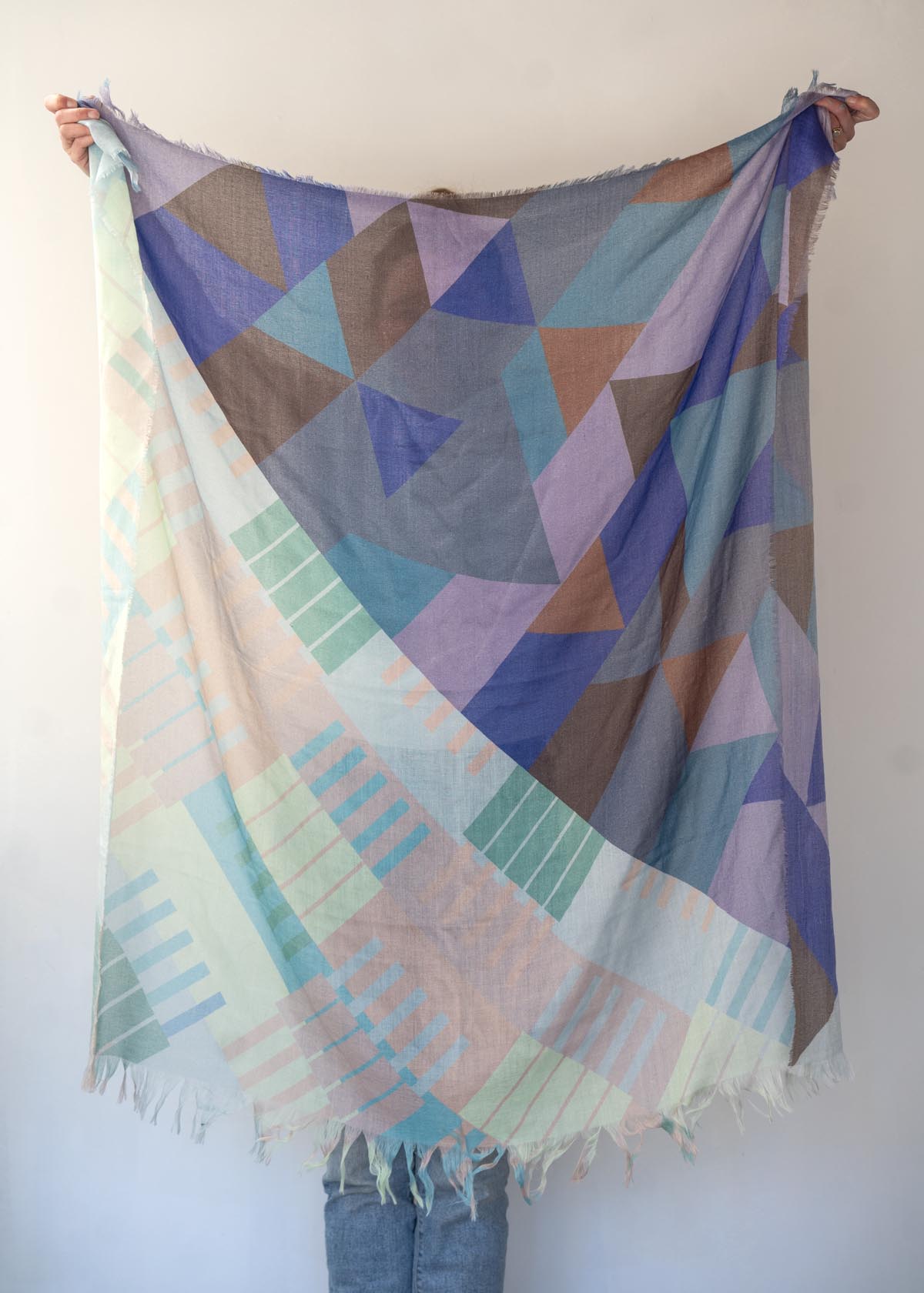 The geometric patterns were designed by Jess, cut and fringed in Truckee, California, the fabric was printed in the UK using GOTS Ecocare certified inks.